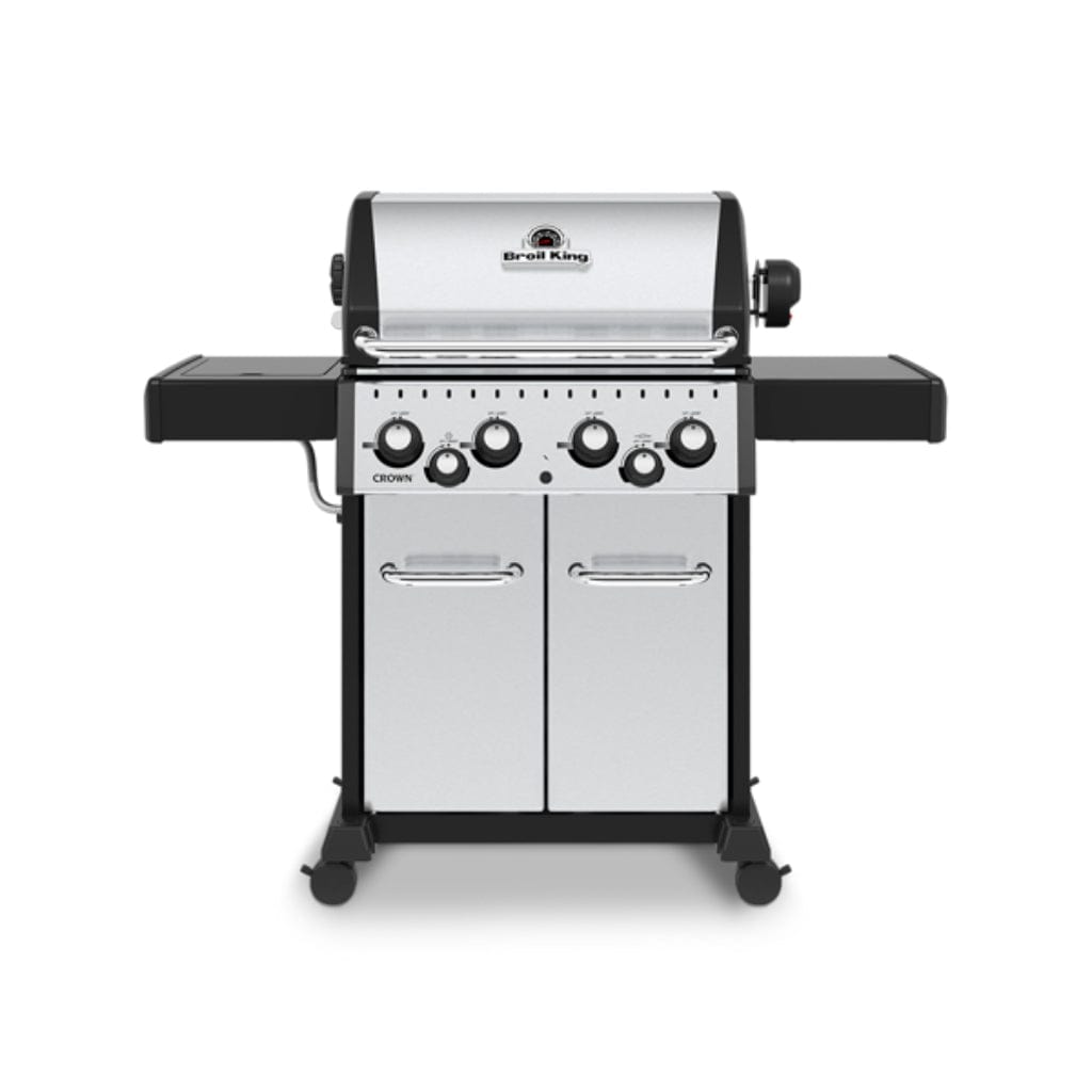 The Broil King® Crown™ 400 Series features a 460 sq. in. primary cooking surface and includes a durable cast aluminum oven, 4 stainless steel Dual-Tube™ burners, stainless steel Flav-R-Wave™ cooking system, and electronic ignition. All Crown 400 series include heavy-duty 3-position cast iron cooking grids, black drop-down side shelves, and an enclosed black cabinet base.