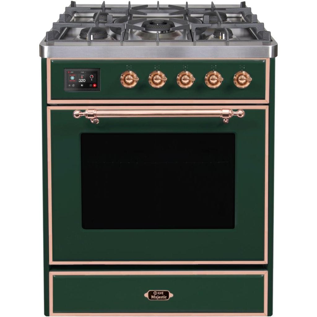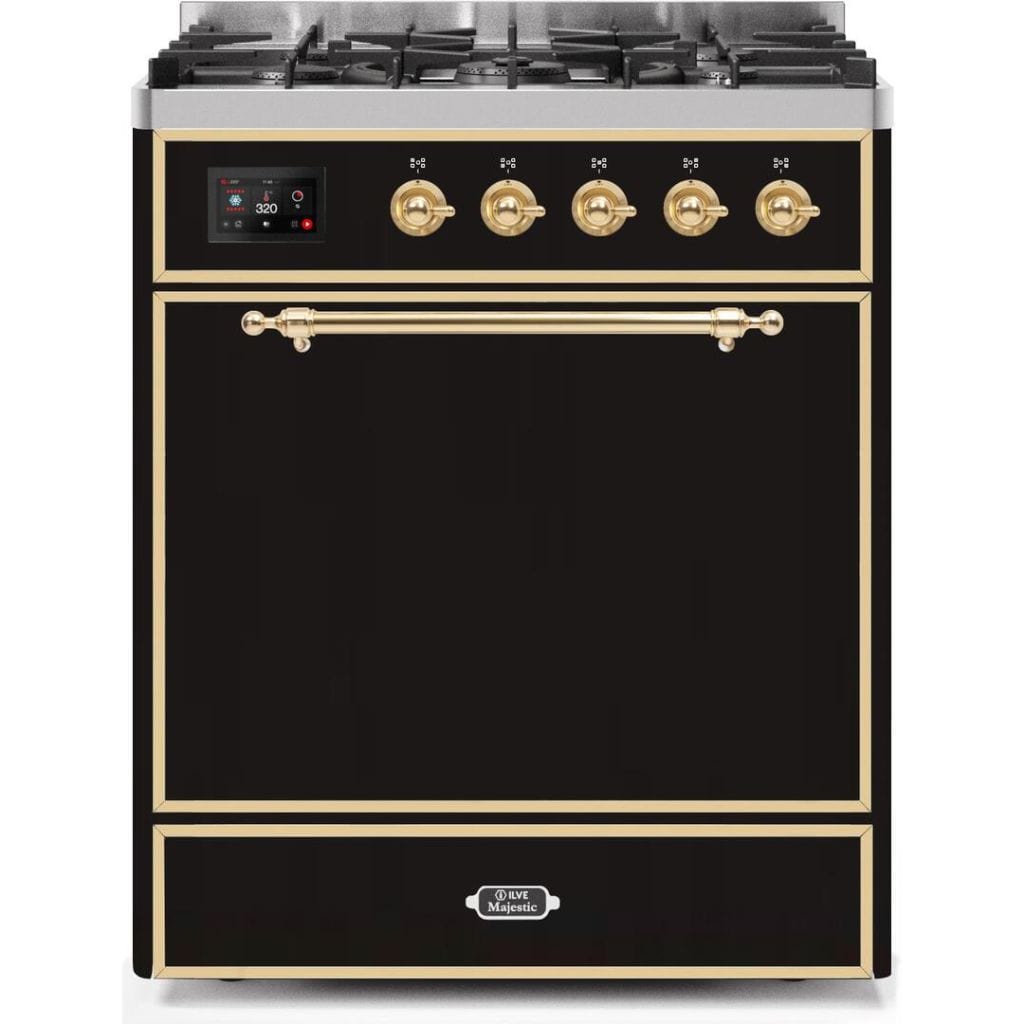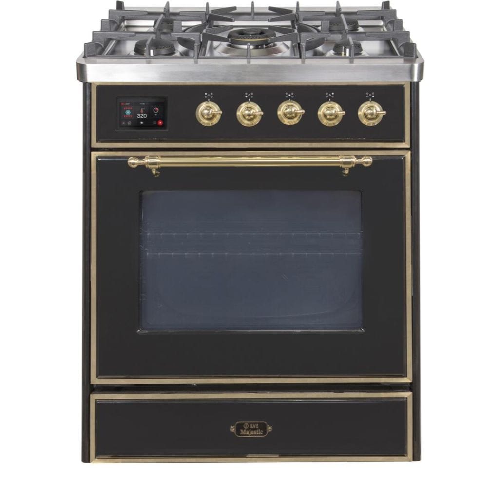 Majestic II Series 30 Inch Freestanding Dual Fuel Range with Natural Gas, 5 Sealed Burners, 4 cu. ft. Total Oven Capacity, Convection Oven, Self-Clean Oven, Continuous Grates, Viewing Window, Handcrafted from Italy, High-End Workmanship, Oven: Defrost Function, Gas Conversion Kit Included, TFT Oven Control Display, Nano-Tech Non-Stick Coated Burners with Trim