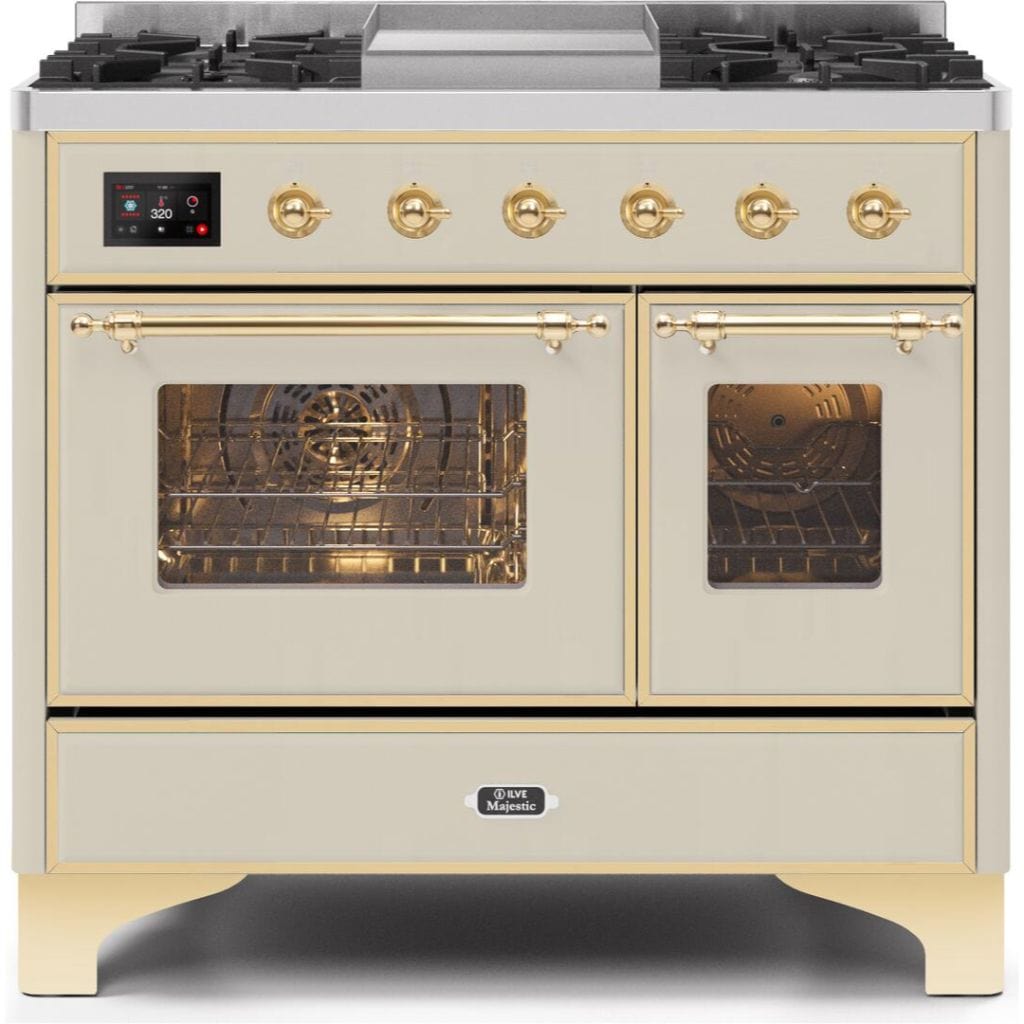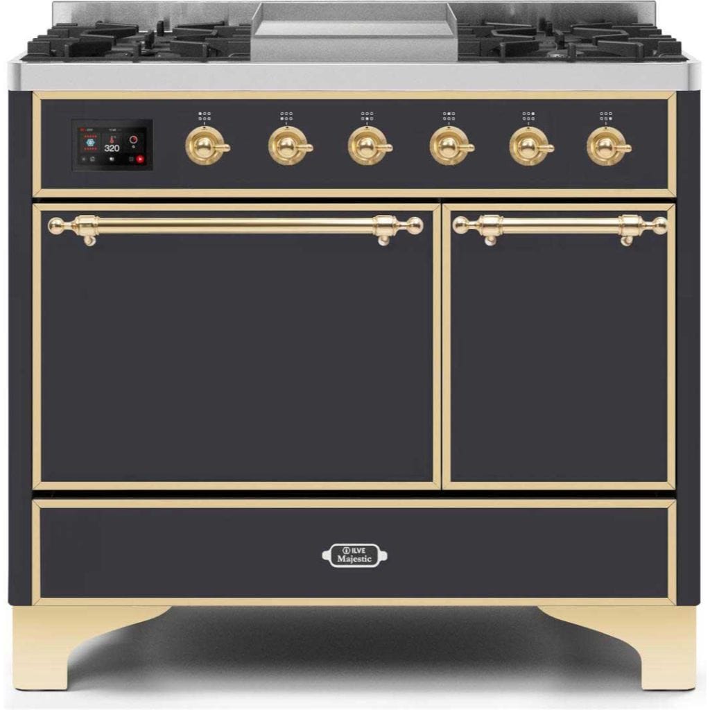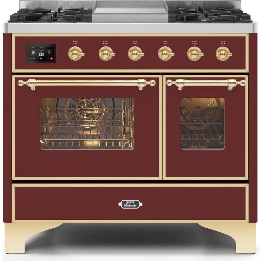 Majestic II Series 40 Inch Freestanding Dual Fuel Range with Liquid Propane, 6 Sealed Burners, Double Ovens, 3.82 cu. ft. Total Oven Capacity, Griddle, Convection Oven, Self-Clean Oven, Continuous Grates, Viewing Window, Warming Drawer, Gas Conversion Kit Included, Handcrafted from Italy, High-End Workmanship, Oven: Defrost Function, TFT Oven Control Display, Nano-Tech Non-Stick Coated Burners, Interchangeable Griddle with Burner Grate with Trim.