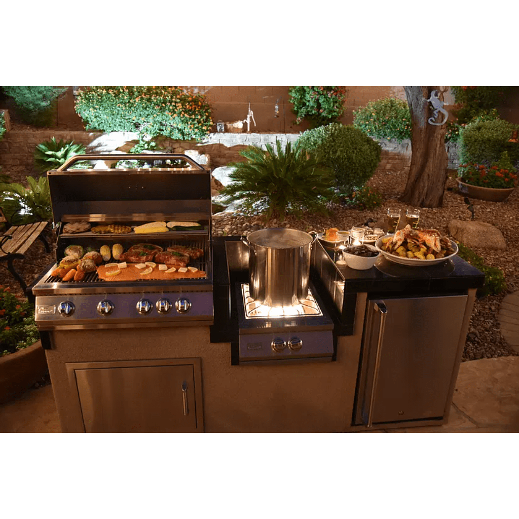 Conventional, Stainless, Natural Gas/Propane, Built-In. The stainless steel cover protects the burner when not in use and features a curved handle to match other Kokomo products. Ignition is created easy with push and turn knobs that provide a reliable flame with every start “Sure Light System” and therefore the full-width drip tray makes clean up a breeze. If you're looking to make a gourmet outdoor meal complete with soups or side dishes, a power burner is a perfect addition to your outdoor kitchen.