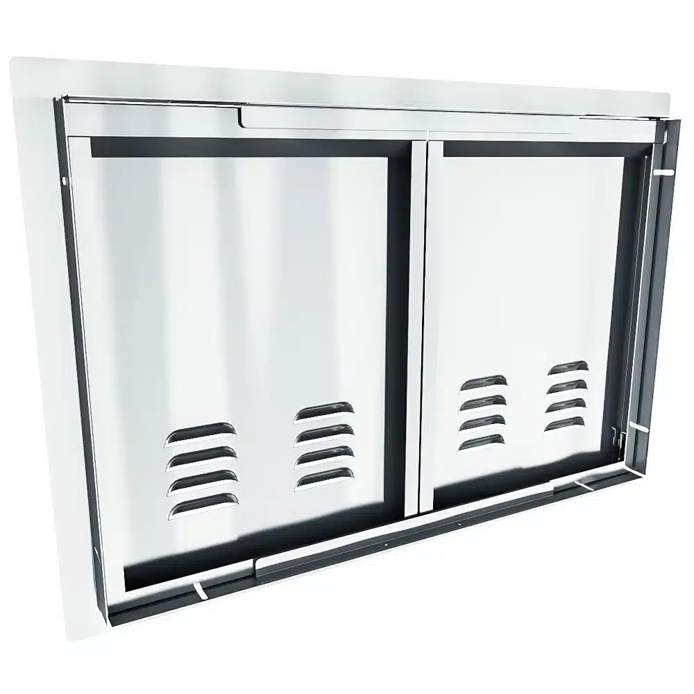 Aruba Series 30 Inch Vented Double doors compliment most BBQ grill sizes, the 30 Inch is most compatible with grill sizes between 28 Inches to 33 Inches, and because of its unique versatility, it works well with your grilling, clean-up, or serving zones. The open-door design allows up to 120 degrees opening to protect the door panel against dinging on the exterior island finish. The Integrated Vent allows for added Safety and Venting of Excess Heat and Gases from the interior of island construction – a Required feature of all Gas Grills. The Double Door is sized to perfectly blend with all other Aruba Series with matching Height for a Designer Appeal. The Door is great for easy access for any gas lines running to the grill and gives clear access to extra storage with clear access.