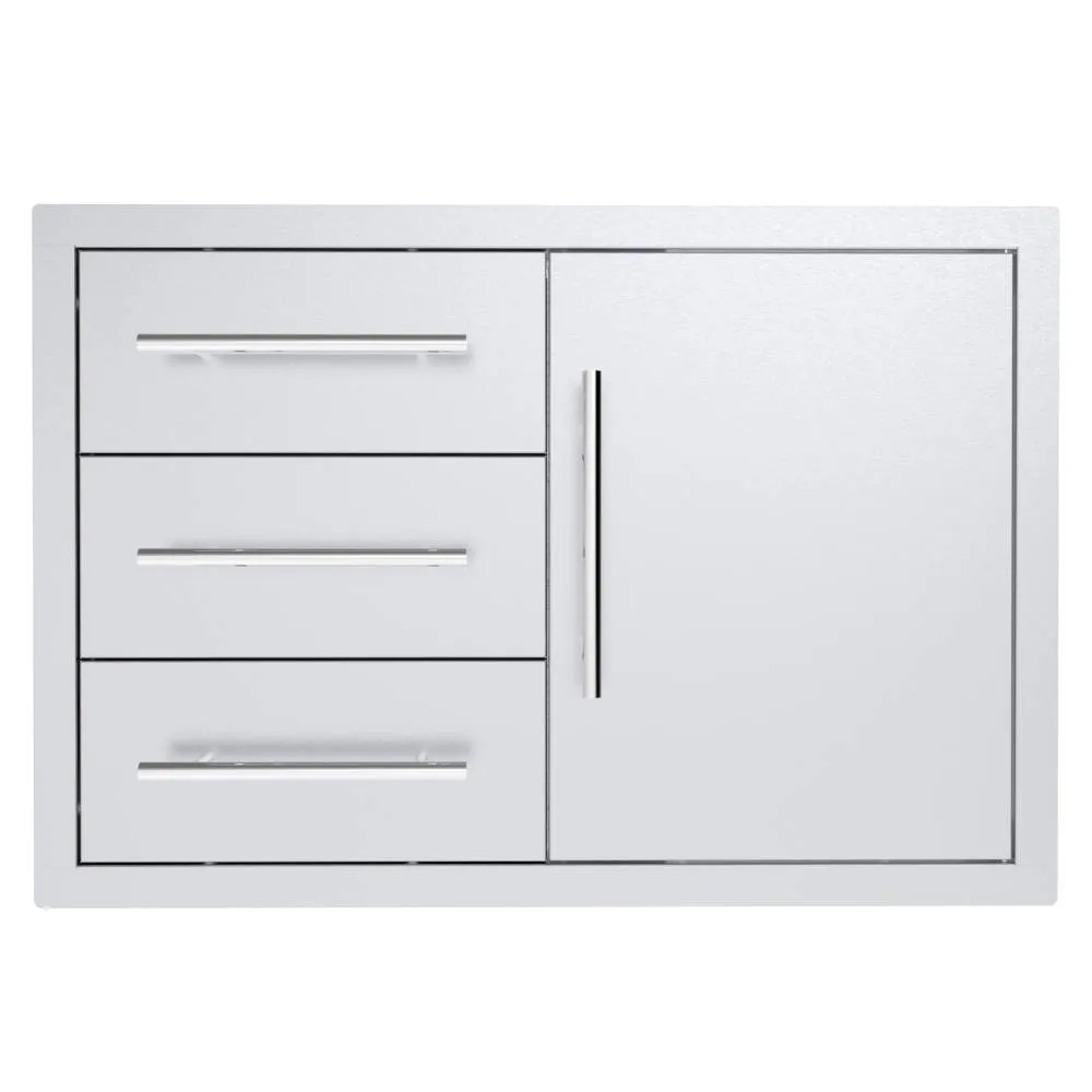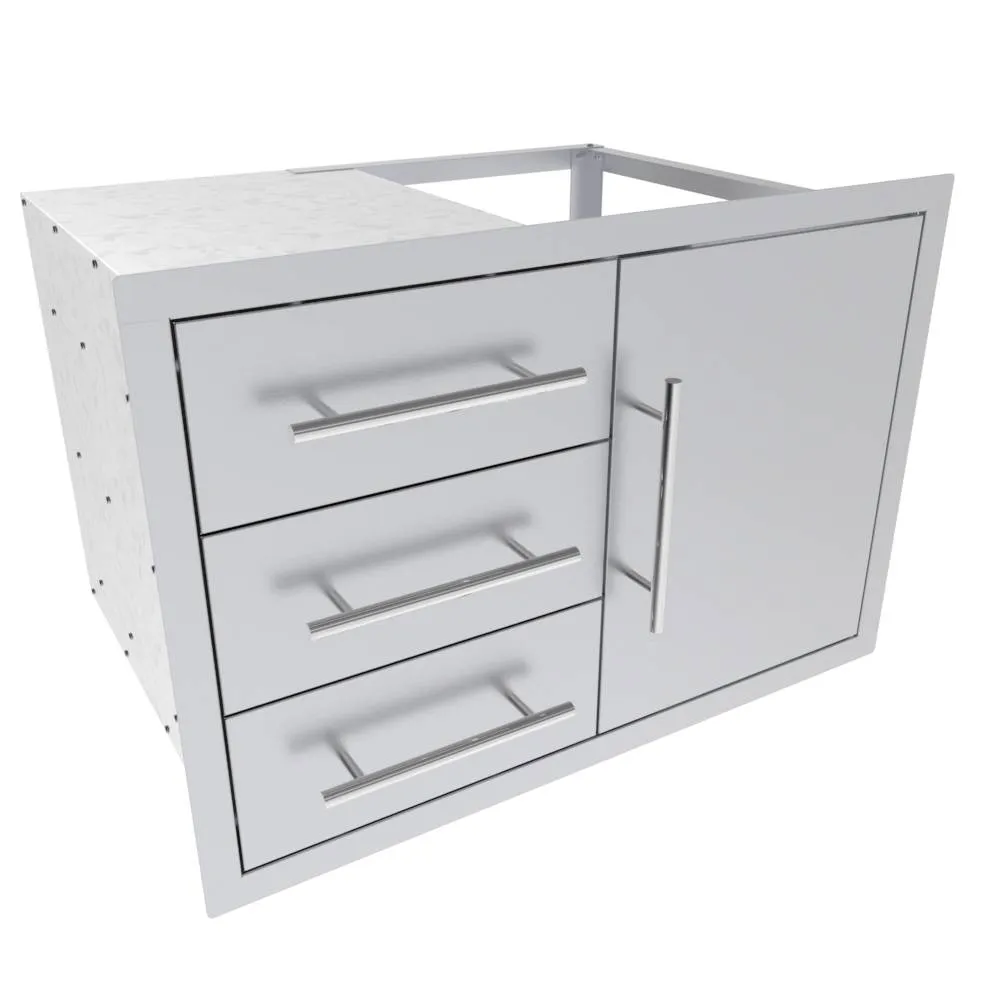 Texan Series 30 Inch Triple Drawer Door compliments most compliments most BBQ grill sizes between 28 Inch to 36 Inch and because of its unique versability it can function below a grill for utility access, propane tank storage or a trash bin location and with three drawers it works in other locations like the Cleanup Zone, or entertainment bar locations because of its unique versability and Multi-Drawer design. The Triple Drawer Door Combo is sized to perfectly blend with all other Texan Series with matching Height for a Designer Appeal.