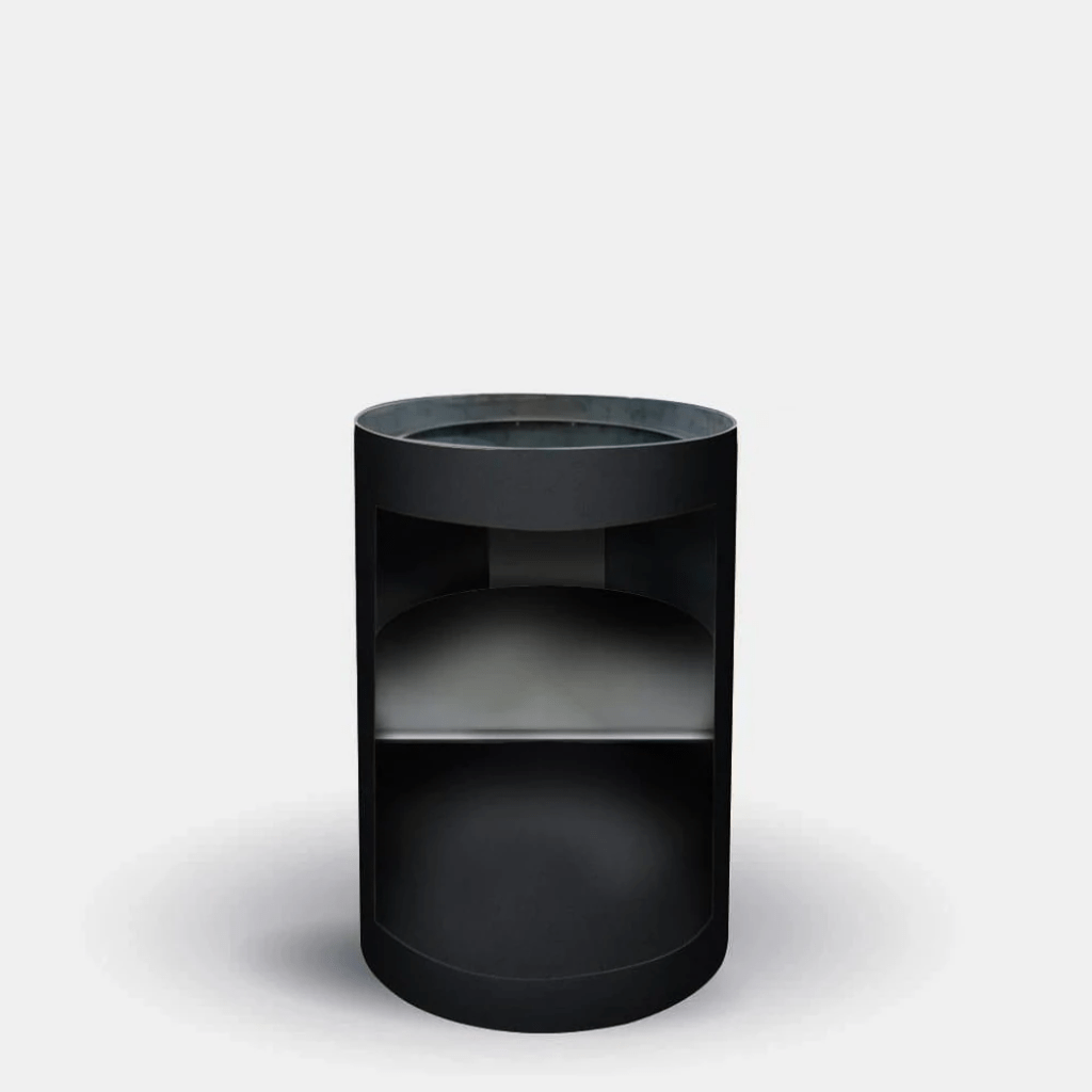 If you are looking for some storage space underneath your Arteflame, you want the Tall Round base With Storage. Perfect for storing your utensils, charcoal or firewood. In case you want to just store firewood, you can remove the middle stainless steel shelve. This shelve divides the storage space into two 10" compartments (18 1/2" deep by 20" wide). The internal draining system ensures al rain water drains away from the storage compartment.