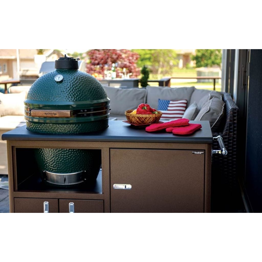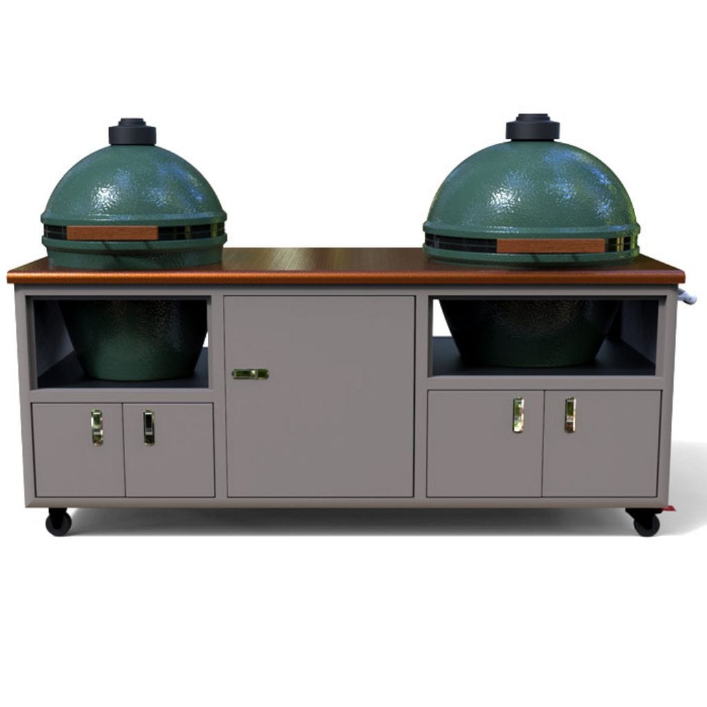 The Challenger 76″ Double Torch Cart for S-XL Ceramic grills does it all with a vast tabletop for abundant food prep space, centrally located grill for easy serving, and several additional features – including plenty of storage space with two spacious cabinets and even space under the grill for utensils, charcoal, or anything else you might need. The counter provides ample space to fit two ceramic grills. Plenty of weatherproof storage space with two spacious cabinets and even space under the grill for utensils, a cooler, and anything else you might need.