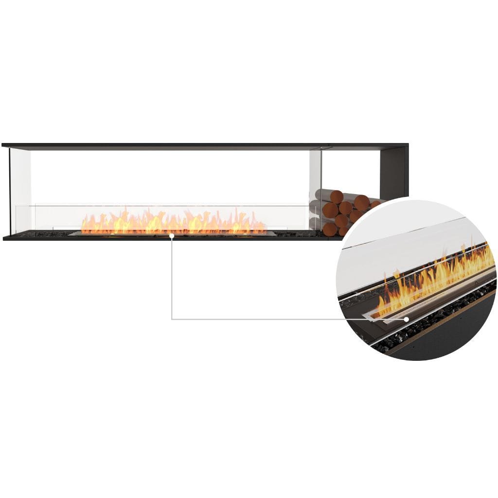 Available in a timeless black finish, Flex Fireboxes come with stainless steel burners and black glass charcoal.