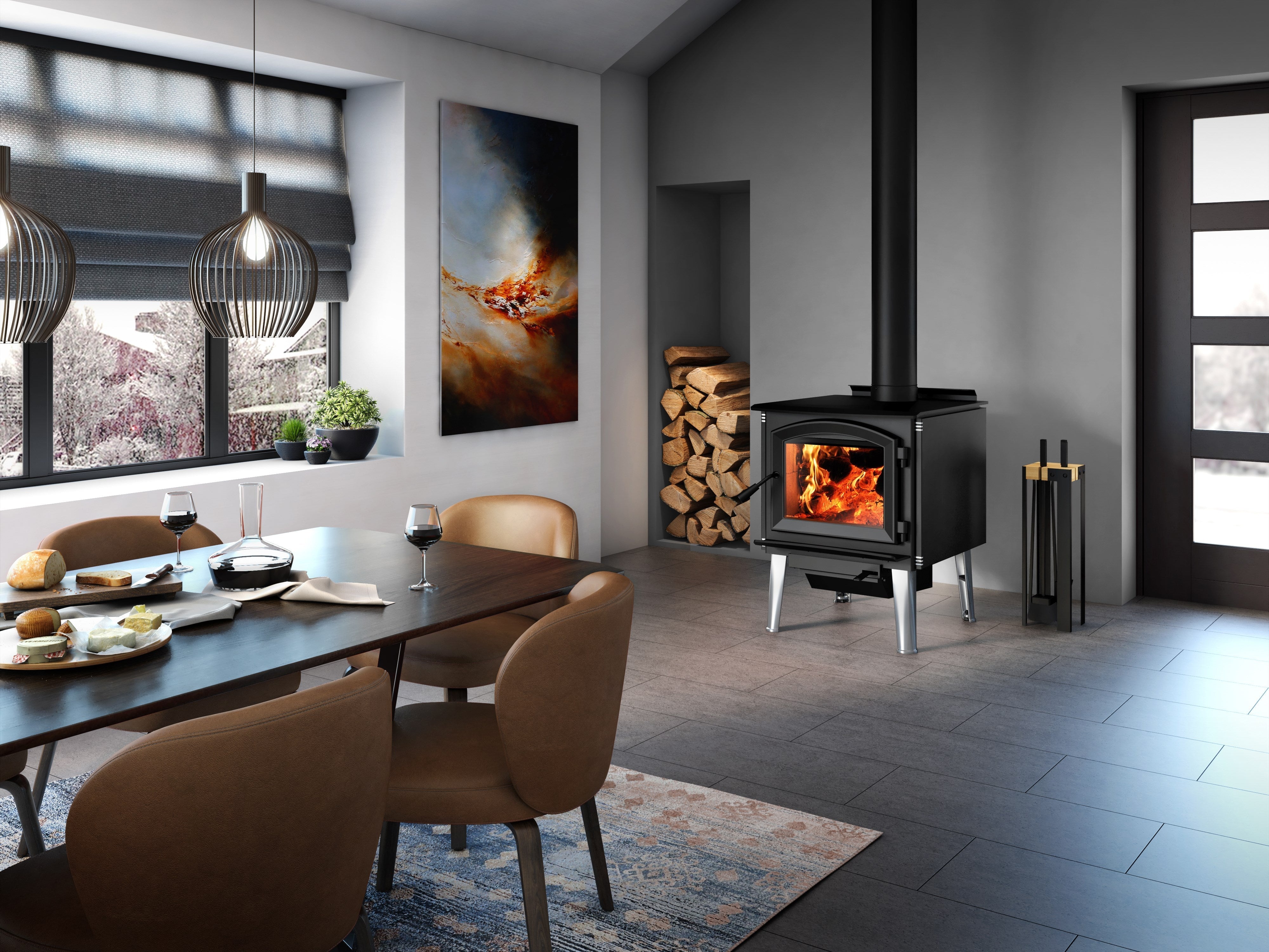 The Solution 3.3 is equipped with side panels fitted with delicate engraved grooves and an arched cast iron door which beautifully highlights the flames. Choose from our pedestal or three leg models, black or brushed nickel, traditional, round or straight. You can also upgrade your appliance with a blower with thermodisc and a rigid firescreen for more comfort.