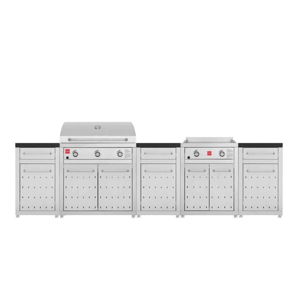 The standard island can be installed as a floating island with open space on the back side or nestled up to a non-combustible wall. Each offers options for door or trash drawer cabinets featuring all 304 SS construction and natural stone countertops.