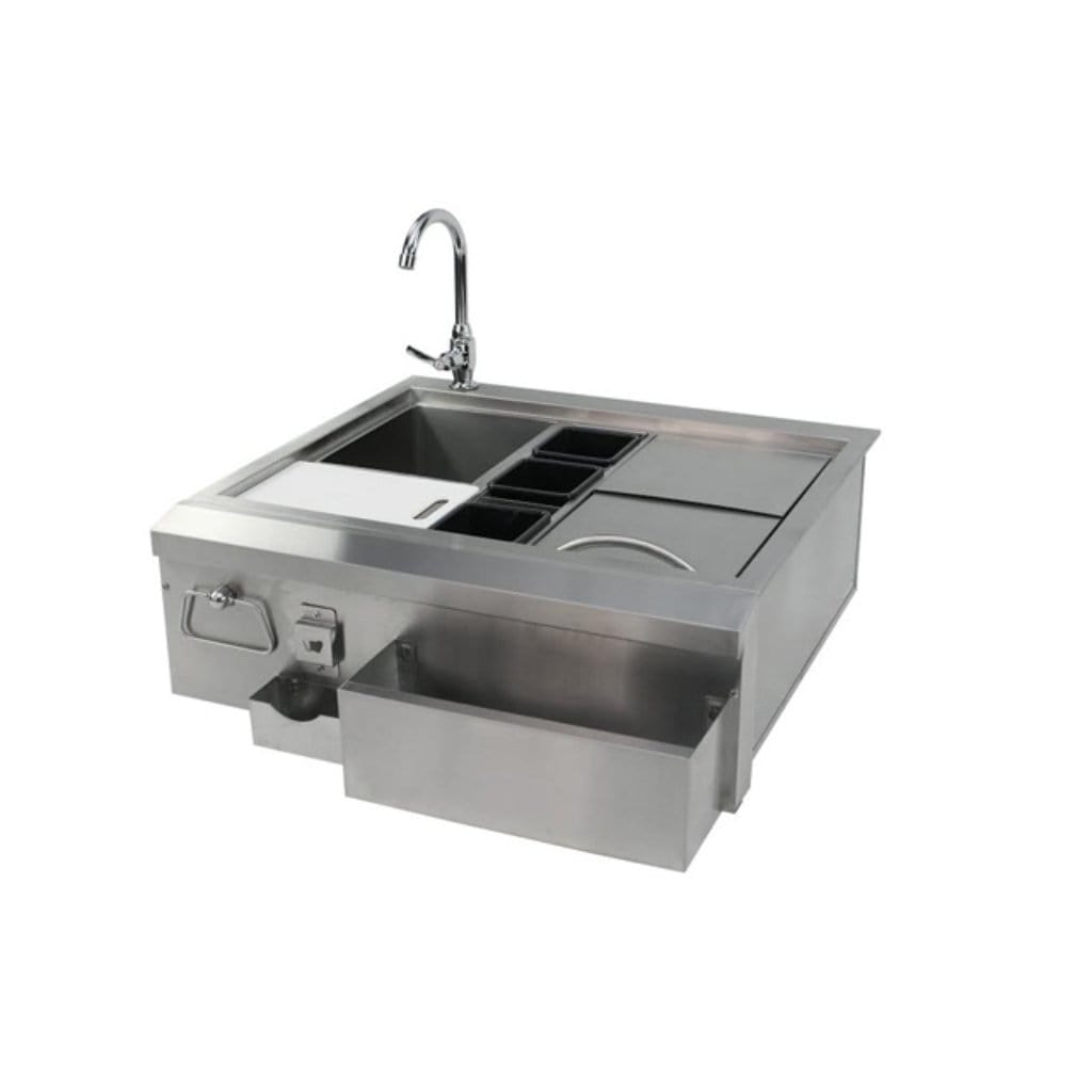 The Jackson Grills 30" Built-In Cocktail Center is constructed out of stainless steel. Assembled as a complete package, the unit includes a large ice chest with stainless steel cover, a sink, speed rail front bottle storage, bottle boots for chilling mixes, a cutting board, a bottle opener, a towel holder and a cold water tap.