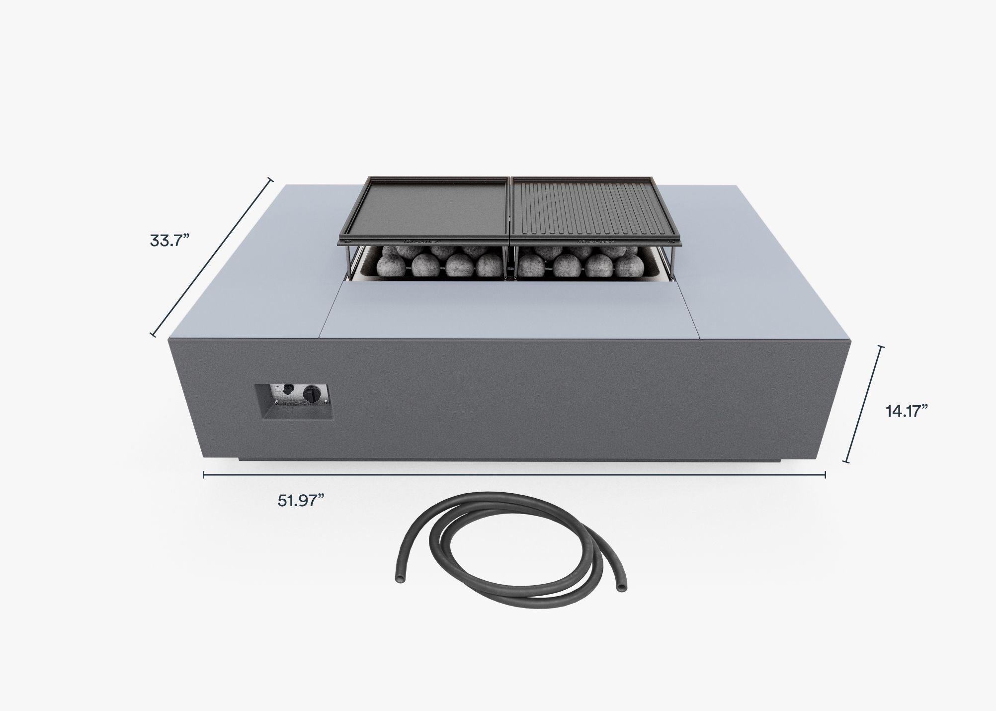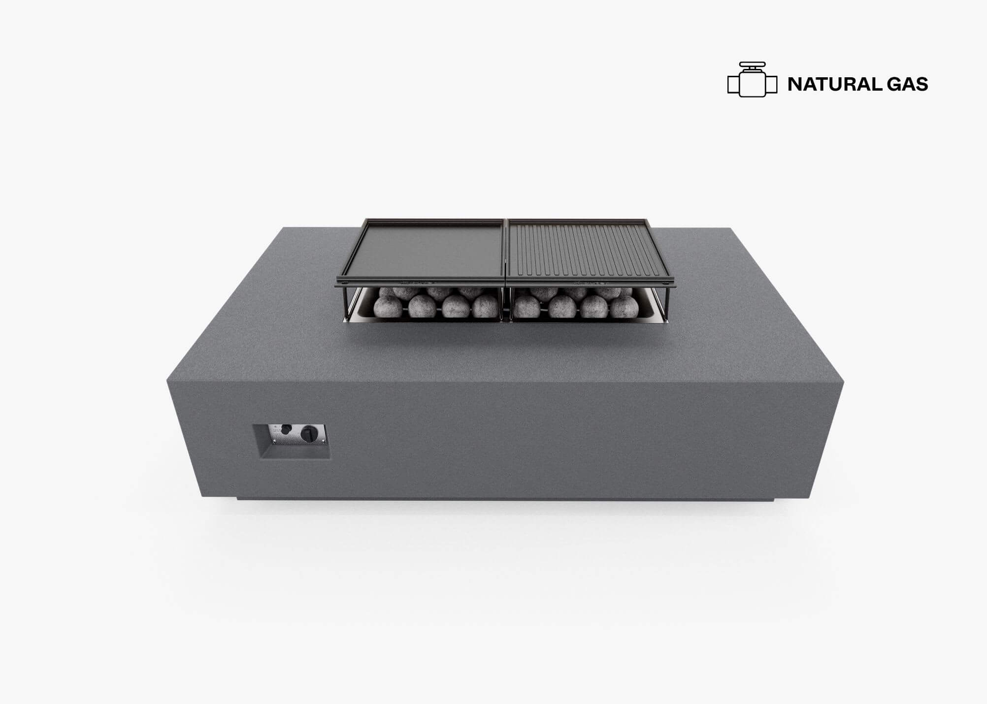 This multifunctional piece brings warmth and fun to your backyard. Enjoy a sleek coffee table with the cover on. Remove it for a cozy fire. Elegant ceramic spheres efficiently disperse heat. Add the griddle and you have a space where everyone can cook, eat, and socialize together.