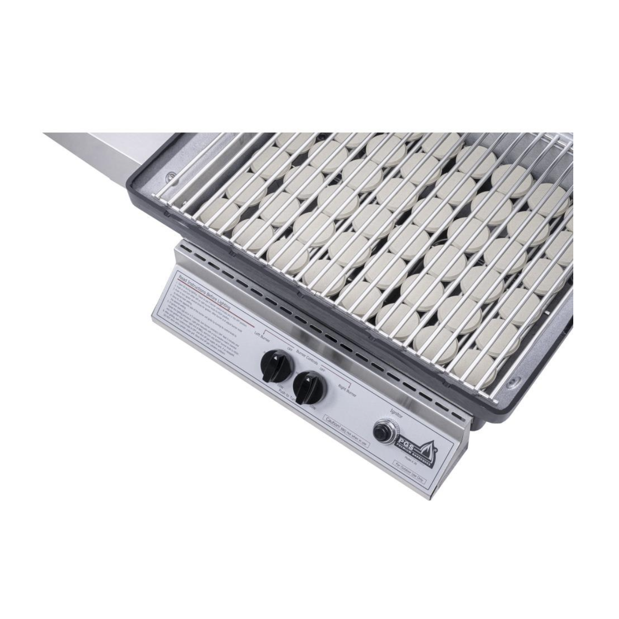 The "T" Series offers the ultimate in flexibility and durability with the widest variety of mounting options in the grill industry. Hight output stainless steel burners for fast heat and controlled timperatures. T30 is 30,000 btu/hr input, "Sure Start" electronic ignition system, 330 sq. in. of cooking area, stainless steel cooking grids, 121 sq. in. of secondary warming rack, stainless steel dual "H" style burner, durable permanent mold aluminum castings, and ceramic "MOON ROK" for even heat distribution. Includes right side stainless steel side shelf. Made in the USA. (Requires mounting option) includes 60 minute PGS Fuel Stop®