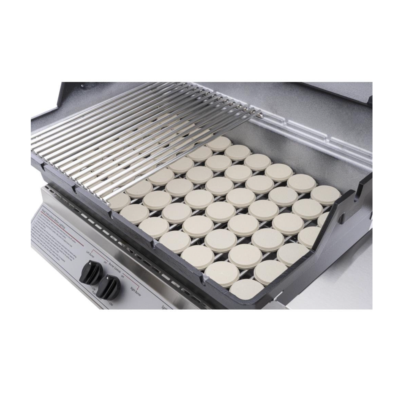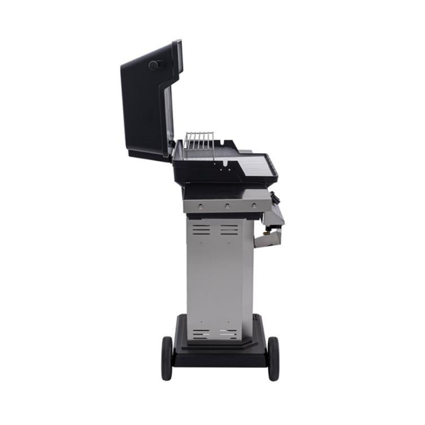 The "T" Series offers the ultimate in flexibility and durability with the widest variety of mounting options in the grill industry. Hight output stainless steel burners for fast heat and controlled timperatures. T40 is 40,000 btu/hr input, "Sure Start" electronic ignition system, 434 sq. in. of cooking area, stainless steel cooking grids, 178 sq. in. of secondary warming rack, stainless steel dual "H" style burner, durable permanent mold aluminum castings, and ceramic "MOON ROK" for even heat distribution. Includes right and left side stainless steel side shelves. Made in the USA. (requires mounting option) includes 60 minute PGS FUEL STOP®