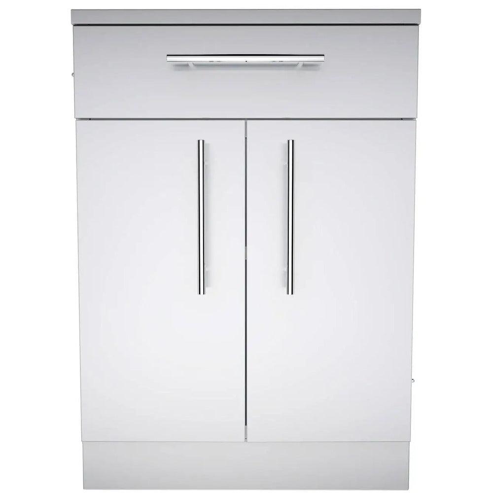 The Sunstone 24 In. double door base cabinet w/shelf and reversible top drawer or false panel offer lots of needed storage space for your outdoor kitchen island and easy access with the center shelf, you can store and categorize multiple items to keep it clean and tidy. This cabinet comes with a single full-depth shelf which is easily removed to allow most sinks or ice chests including the Sunstone standard sink item no. B-SK20 or the commercial quality sink item no. B-PS21 while all plumbing can be installed by removing the covered floor utility access hole. The top-false panel is perfect for covering up unsightly sink basins or other plumbing of all appliances.