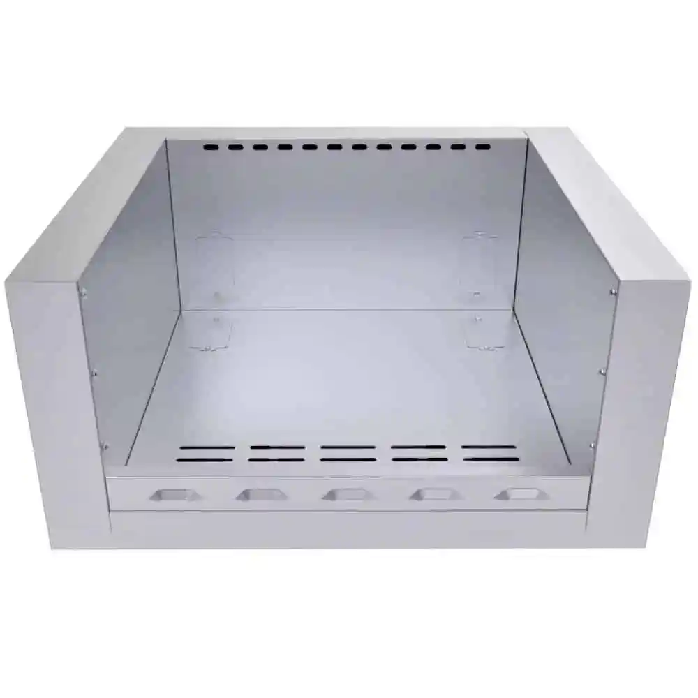 The Sunstone Universal Appliance Jacket is uniquely designed to receive multiple Burner Brand Models right out of the box with minor assembly. The jacket is a safety essential when installing your burner into any outdoor kitchen or BBQ island enclosure ensuring you have an adequate heat barrier and proper venting. This jacket has double-walled construction in all 304 stainless steel with a sturdy self-supporting raised ledge around the sides and back that adds one more layer of quality to your outdoor kitchen. The Sunstone Jacket is made for perfect airflow with in/out vent in the lower front bottom edge and upper back edge which features open vents allowing pass-through venting of all excess heat and dangerous gasses. It has a universal design with covered utility ports on either side depending on which side your appliance gas or electrical is connected, you only need to open the specific ports you are using, and others stay covered for safety