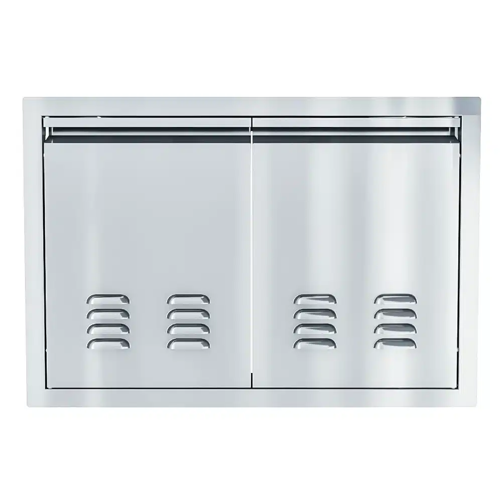 Aruba Series 30 Inch Vented Double doors compliment most BBQ grill sizes, the 30 Inch is most compatible with grill sizes between 28 Inches to 33 Inches, and because of its unique versatility, it works well with your grilling, clean-up, or serving zones. The open-door design allows up to 120 degrees opening to protect the door panel against dinging on the exterior island finish. The Integrated Vent allows for added Safety and Venting of Excess Heat and Gases from the interior of island construction – a Required feature of all Gas Grills. The Double Door is sized to perfectly blend with all other Aruba Series with matching Height for a Designer Appeal. The Door is great for easy access for any gas lines running to the grill and gives clear access to extra storage with clear access.