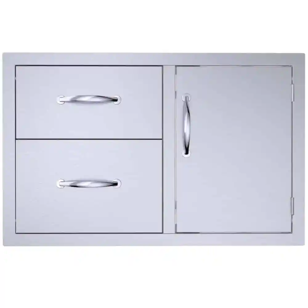 Sunstone Classic Series Flush Style 36 Inch Double Drawer Door Combo compliments most BBQ grill sizes between 34 Inches to 38 Inches and because of its unique variability, it works well with your cleanup or serving zones. Two Extra-Wide drawers to the left provide easy access for all your larger BBQ sauces, towels, and BBQ tools plus the versatile right side single door which works perfectly for either a large propane tank storage or plastic trash bin as shown. The open-door design is great for easy access for any gas lines running to the grill and gives clear access for extra storage or remove the inside horizontal and vertical framing for full access to the interior of your island’s construction.