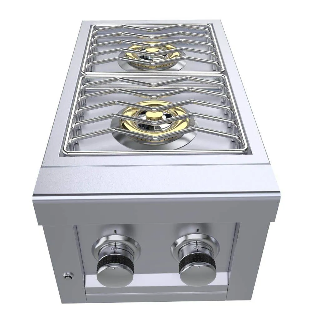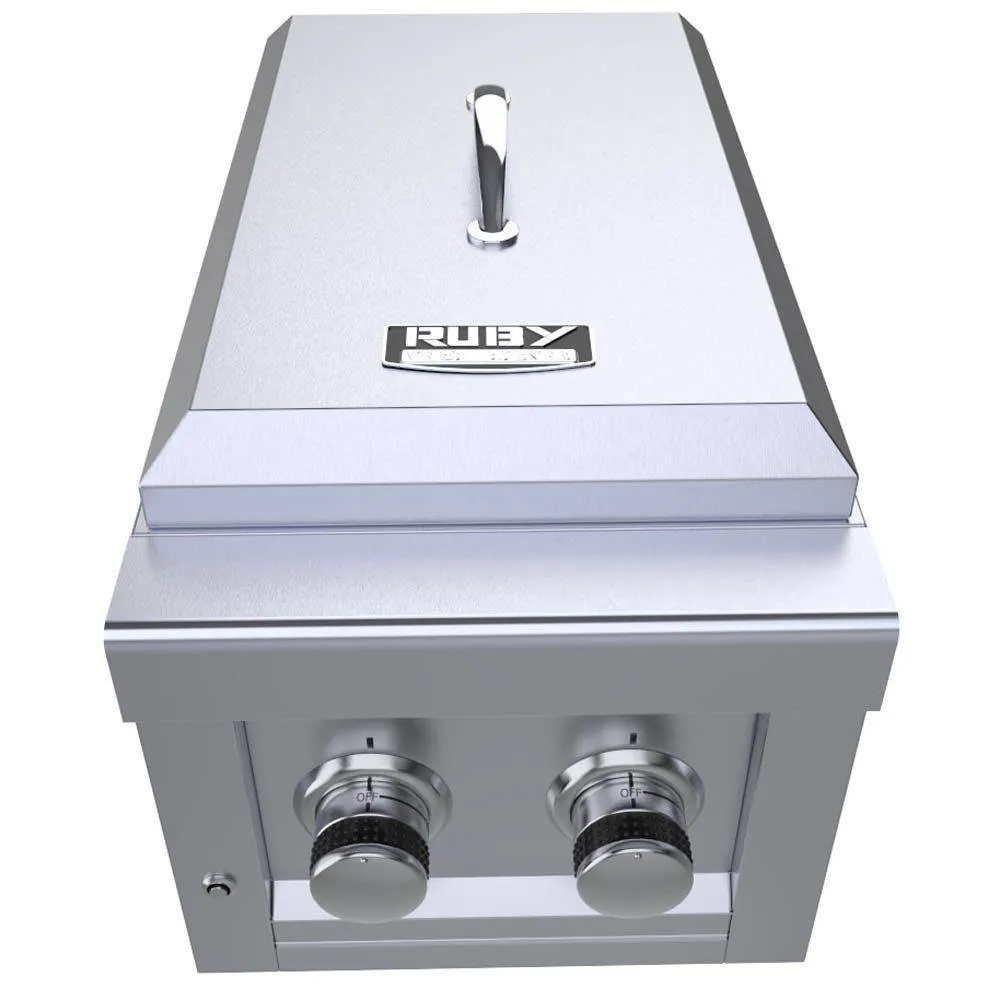 Sunstone® Ruby Series™ Double Slide-in Burner features Two heavy-duty up to 15,000 BTU Versa Burners™ – Totaling 30,000 BTUs – all Brass Burners with a Lifetime Warranty, and all 18 Gauge 304 Stainless Steel Construction, complimenting this with Solid 3/8 in. 304 Stainless Steel Raised Cooking Grates. The Double Slide-In Burner Features High-Searing Heat times two, enough for the largest WOK Cooking, or Stir-Fry Pan Cooking, with its adjustable surround flame, and raised cooking grates providing better airflow around the burner for superior performance. This Double Burner is Uniquely Designed with a front LED accent light, all polished accents, and a fully detached cover, allowing the use of larger cooking pans and 180 degrees of access. The Ignition is an easy reliable Piezo Valve Ignition, with Two Large Rubber Gripped Gas Valve Knobs, which work well as a heat buffer, so as not to burn yourself. For anyone seeking to create the perfect outdoor kitchen and needing the right Double Side Burner to compliment your large grill, this may be the perfect one for you with its versatility and high-quality construction, ensuring it will last for many years to come.