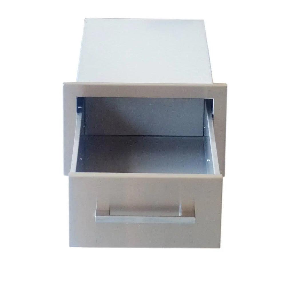 Sunstone Signature Series Beveled Style 8.5 Inch Height by 14 Inch Width Single Drawer Unit is uniquely versatile and works with your Cleanup or Serving Zones acting as a Top Cutlery or Dry Towel Drawer, place One or Three in a Horizontal Row above any other larger Doors and or Component Below and make use of the often wasted space with some Needed Extra Storage. Constructed with all 304 Stainless Steel Frame and Paneling and Drawer Boxes, with complimentary 201 Stainless Steel enclosed drawer box.