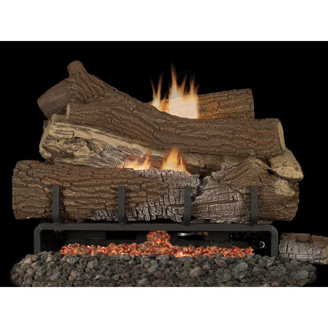 VENTED GAS LOG SETSPrimarily chosen for decorative applications, vented gas log sets offer the ambiance of a traditional real wood fire with the convenience of gas. Since these log sets are only approved for use in fully vented wood-burning fireplaces that can withstand higher temperatures, they are able to burn with larger, more realistic flames and embers. Electronic ignition models combined with remote controls bring another level of convenience. Vented gas log sets also eliminate the work and mess associated with building, tending, and cleaning up after a wood fire.
