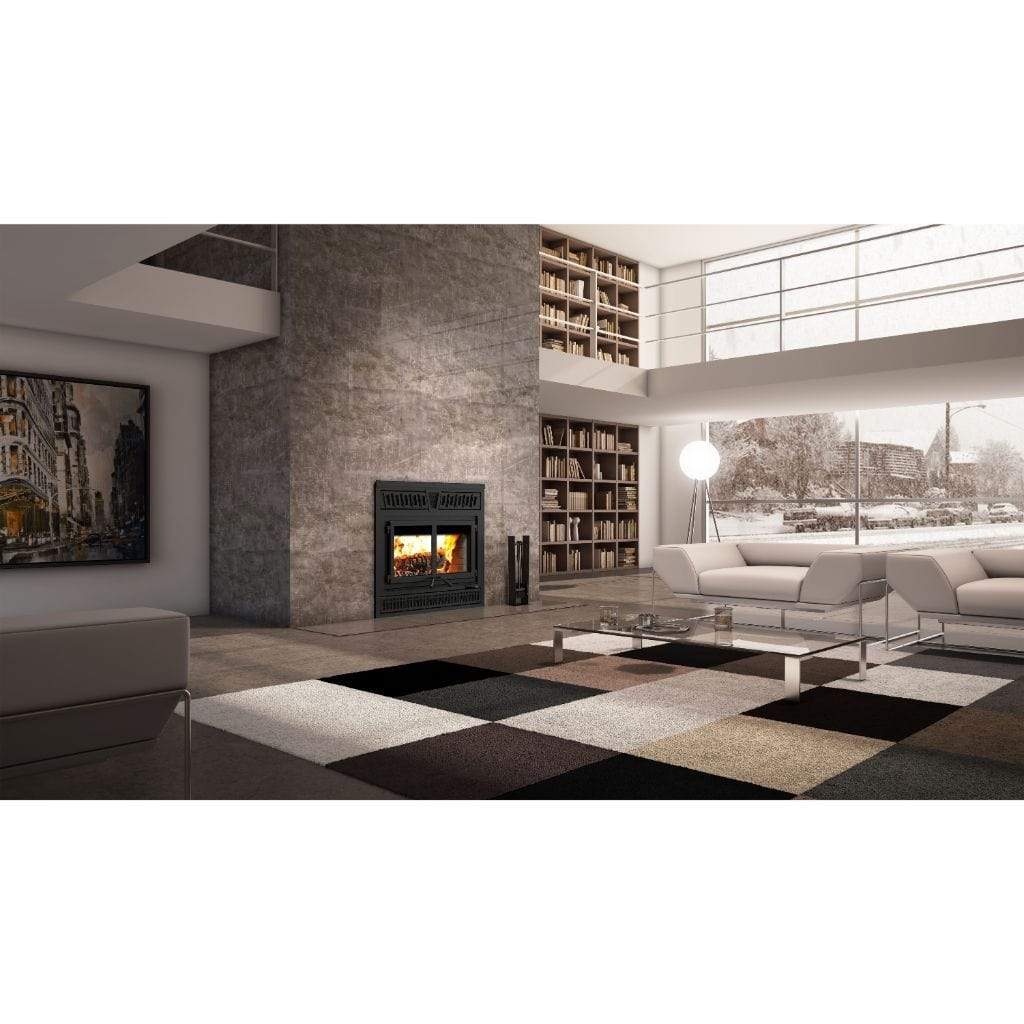 Large wood fireplace. Behind its large glass door, the 4.3 cubic foot combustion chamber can hold an impressive 60 lb of wood.