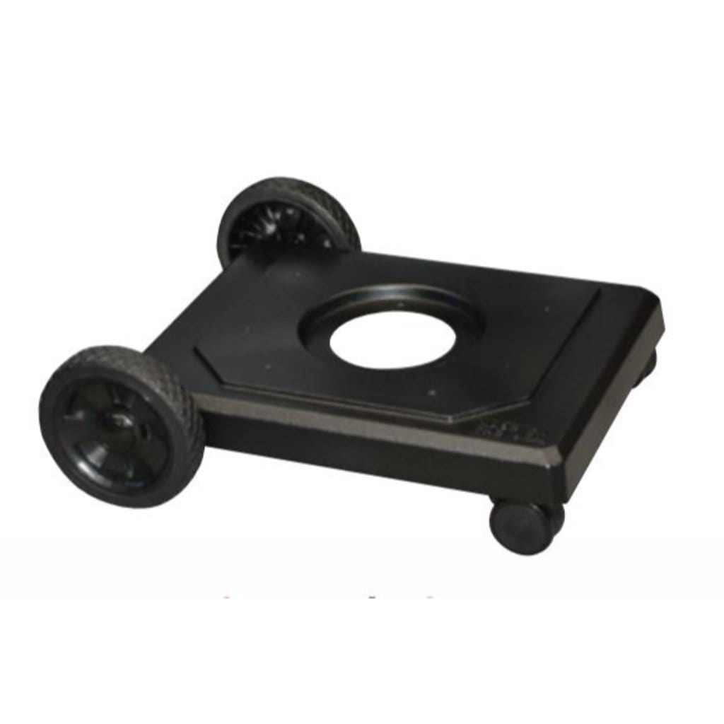 Black Powder Painted cast aluminum portable base with 8" rubber wheels and locking casters. Fits OCOLB or OCOL column. OM-N Model has 12 foot hose with quick disconnect coupler.