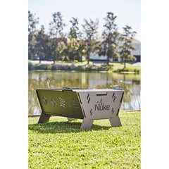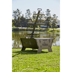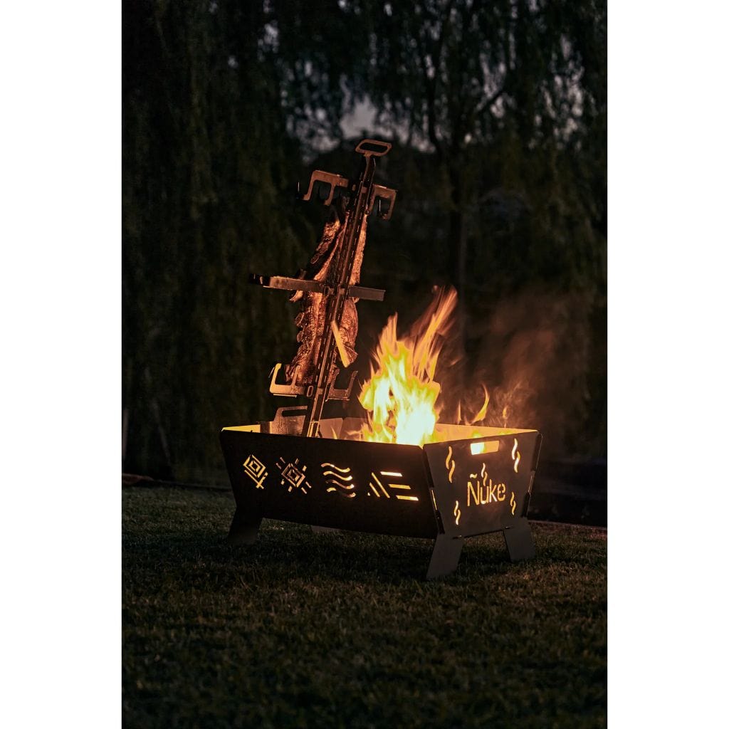 The Huapi 70 is fabricated from durable 1/8” powder-coated steel to withstand high heat and repel corrosion. The collapsible fire pit/grill is easily assembled without the need for hardware or tools and can be stored flat when not in use. Shipped with two half grill grates and a traditional Asado iron cross, the Huapi quickly transitions from firepit to grill. Each grill grate includes a grooved channel that fits snuggly on top of the pit to keep the grates in place while allowing them to slide back and forth across the pit. Add an optional plancha for flattop grilling burgers or vegetables.