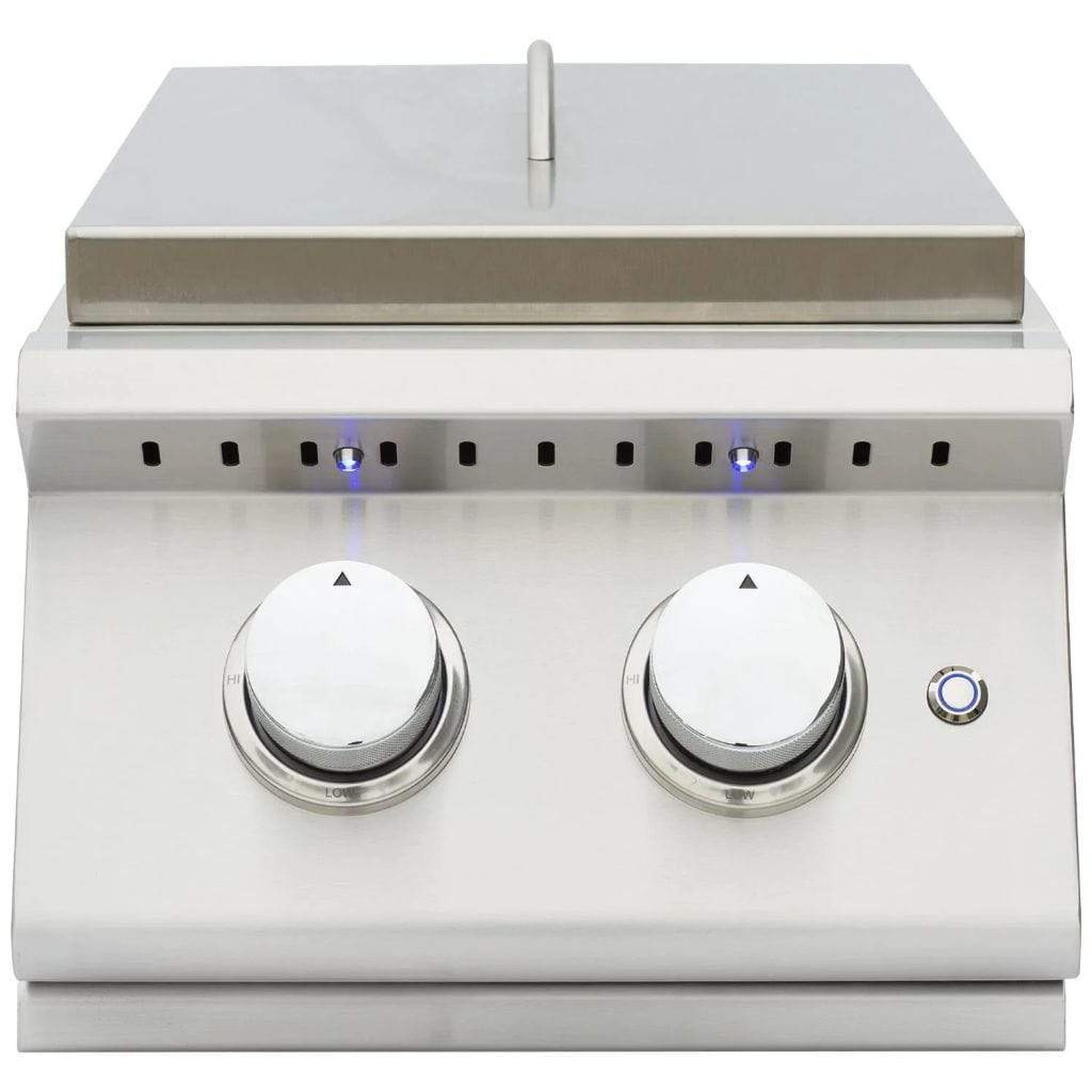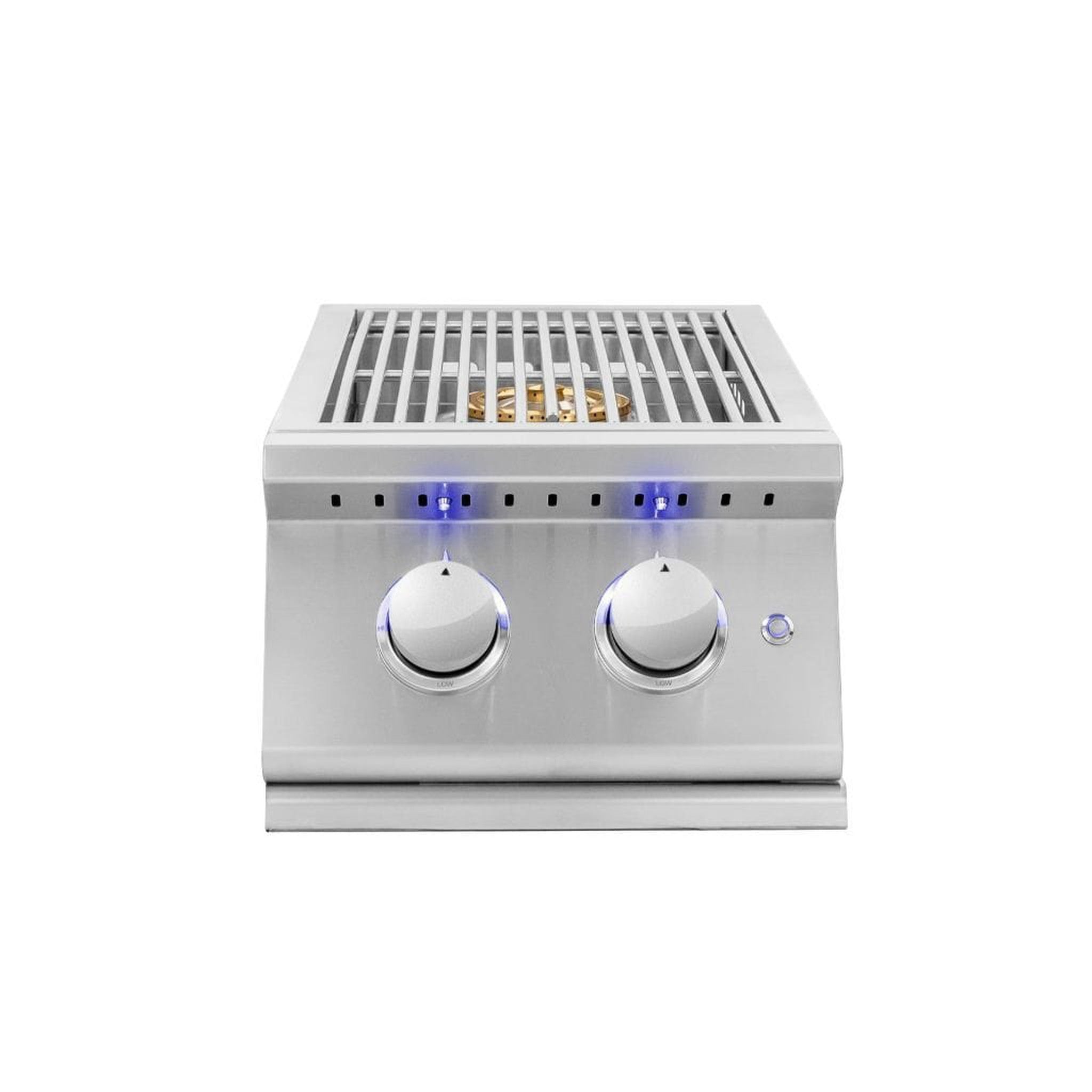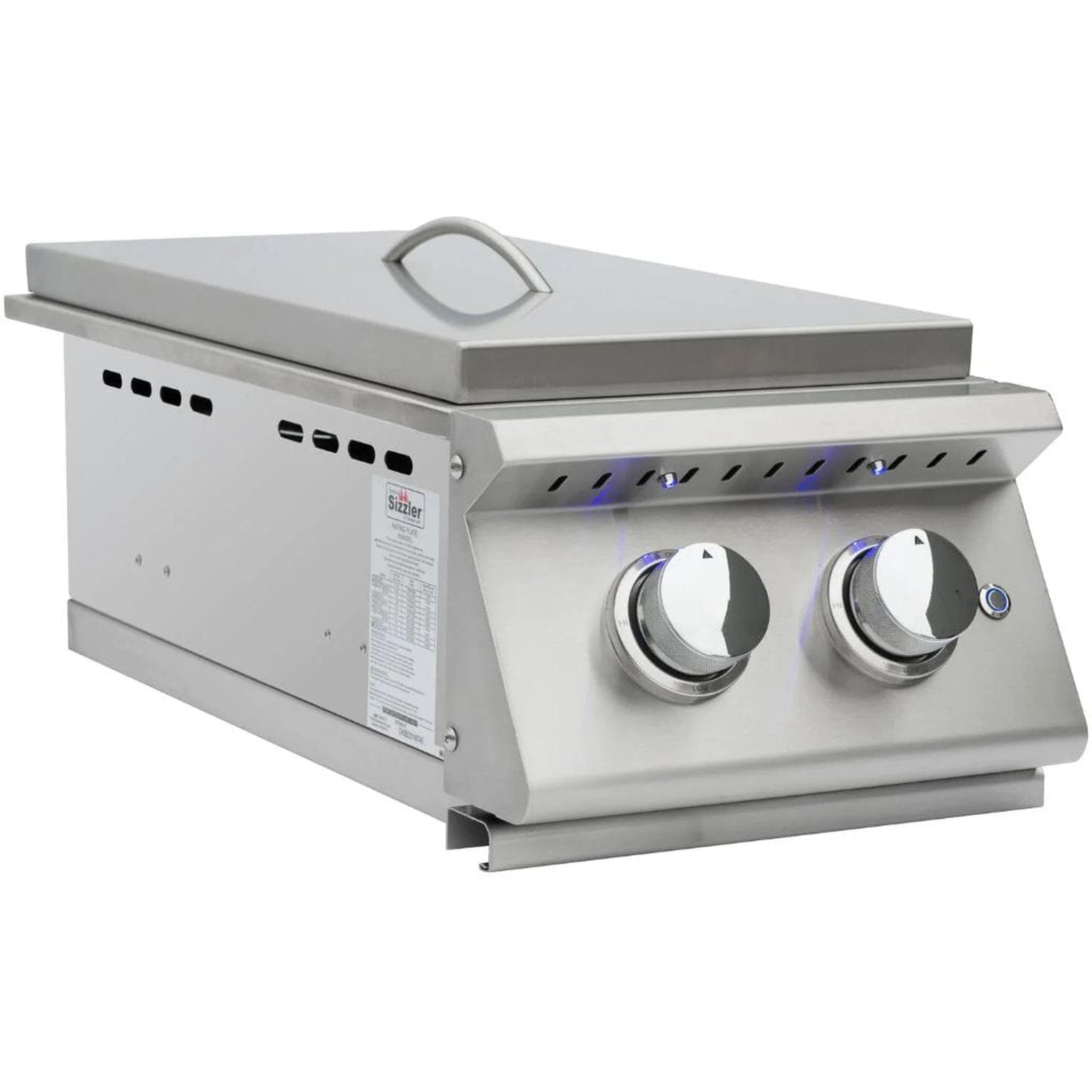 The Summerset Grills (SIZPROSB2) gas double side burner features two(2) heavy-duty 12,000 BTU polished brass plated burners for enhanced performance and superior heat retention. The Summerset Grills SIZPROSB2 double side burner is made of 304-grade stainless steel and will provide you years of outdoor cooking enjoyment. The stainless steel removable lid protects the burners when they are not in use and features a curved handle to match other Summerset Grills Products. Front control panel matches exactly to the Summerset Grills Sizzler Pro Series grills and bright blue LED lights to illuminate the knobs for beautiful nighttime aesthetics. Reliable startup every time, with the Sure-Strike ignition system. If you are looking to create a gourmet outdoor meal complete with soups or side dishes, a built-in side burner is an ideal addition to your outdoor kitchen.