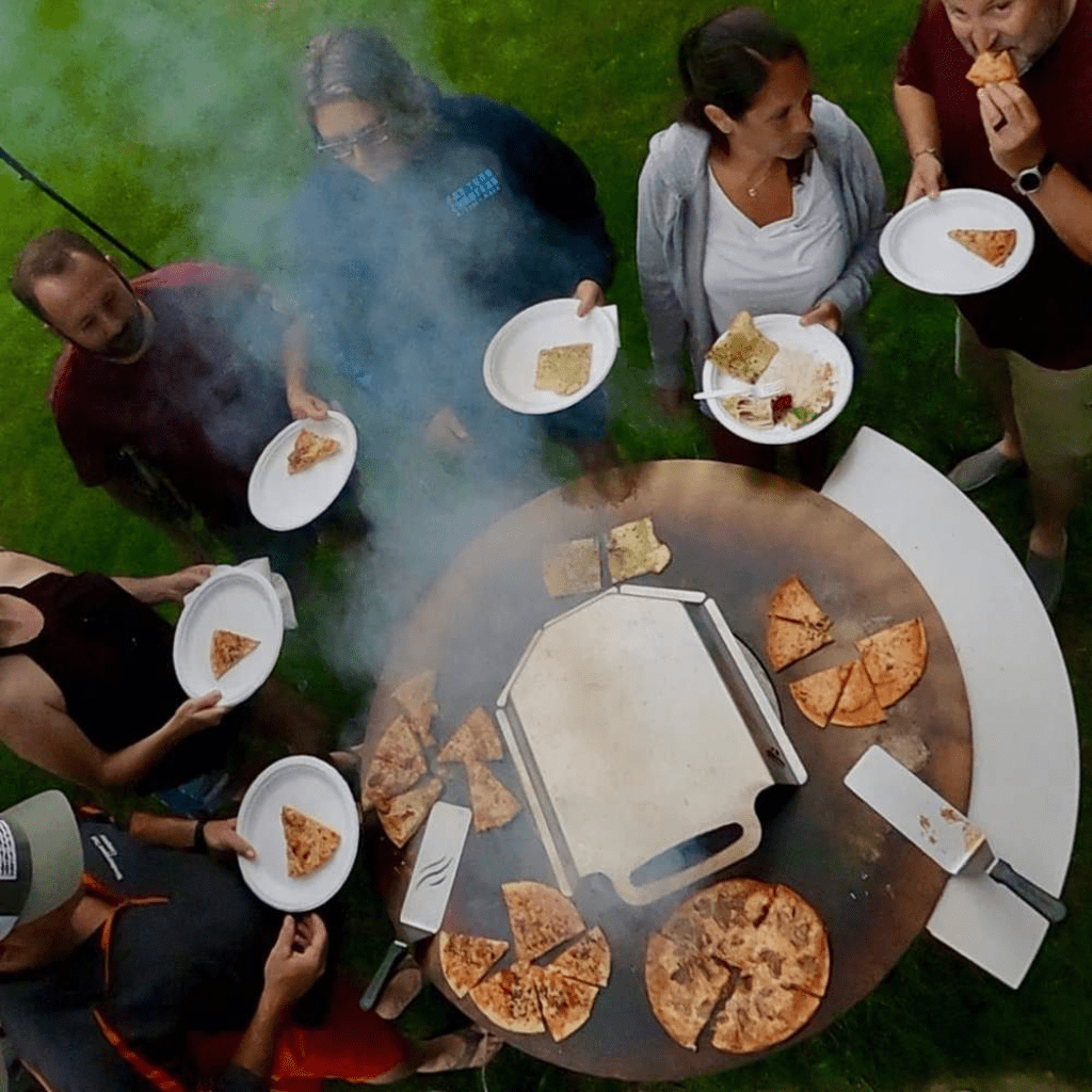 Arteflame is the leading American manufacturer of charcoal and wood fire grill griddle (plancha) combination outdoor barbecue grills and fire pits. Built exceptionally solid, they are designed to last for years and years with little to no maintenance. When you buy an Arteflame grill, fire pit or griddle grill combination insert (grill grate replacement plancha) for your barbecue, you are buying barbecue products that are 100% made in the America. Arteflame is known for making solid steel grill griddle combination cooktops that make grilling easy and fun. Whether you are grilling on the plancha style griddle, searing over the fire on the grill grate, using the rotisserie or the pizza oven, there are many ways to grill your food to perfection on an Arteflame grill. Arteflame cooktops are made of extra thick carbon steel while the grill bodies are made entirely of Corten steel. Corten steel is also called “weathering steel” and is used in many outdoor structures like buildings, bridges and architectural works of art that live outside. Each grill develops a unique, gorgeous patina that is ever changing. Arteflame grills have an airflow system that is completely internal without any moving parts or adjustments. This airflow generates more heat with. minimal smoke while using less wood and charcoal than other barbecues in its class. Because the cooktop can be taken off, every Arteflame grill easily converts into a fire pit. (Lifting tool included) Arteflame style grilling is also known as Mongolian, Korean, Hibachi, Plancha or Teppanyaki style grilling. Griddle grill combination inserts allow you to grill Arteflame style on your barbecue by replacing your existing grill grate. Replacing your grill grate with a grill griddle combination Arteflame insert gives you the flexibility of adding countless other foods to your cooking and grilling repertoire. Griddle grill grate replacement inserts fit most popular grills like; akorn, kamado, oklahoma joe, joe classic, big joe, green egg, napoleon, traeger, weber, weber summit, genesis, blackstone and most gas grills and other charcoal barbecues. All Arteflame griddle grill cooktops, grill grates, replacement grill grate inserts and the awesome little burger pucks are made of extra thick carbon steel and season just like cast iron cookware. Cooking on seasoned carbon steel or cast iron is regarded as the “gold standard” for preparing the best tasting food possible. Arteflame griddle grill combination cooktops will last a lifetime and are not brittle or prone to cracking like cast iron. Get your Arteflame and see what you’ve been missing in your back yard all of these years. Invite friends and family and you'll see why the Arteflame is called "The Social Grill"!