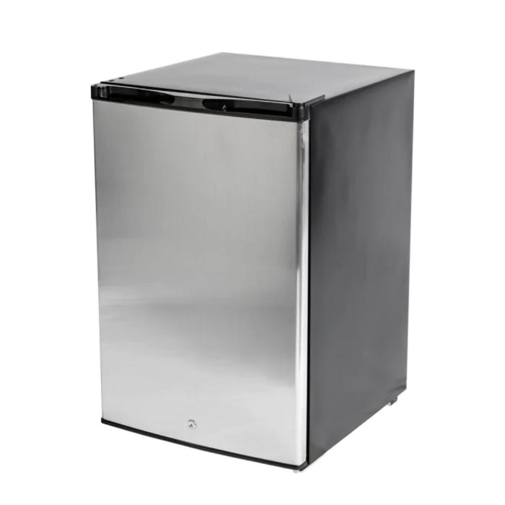 The Barbeques Galore Turbo Cooler freestanding refrigerator offers 4.5 cubic feet of storage space, plus an integrated freezer compartment. The door is constructed of stainless steel. Not outdoor rated.