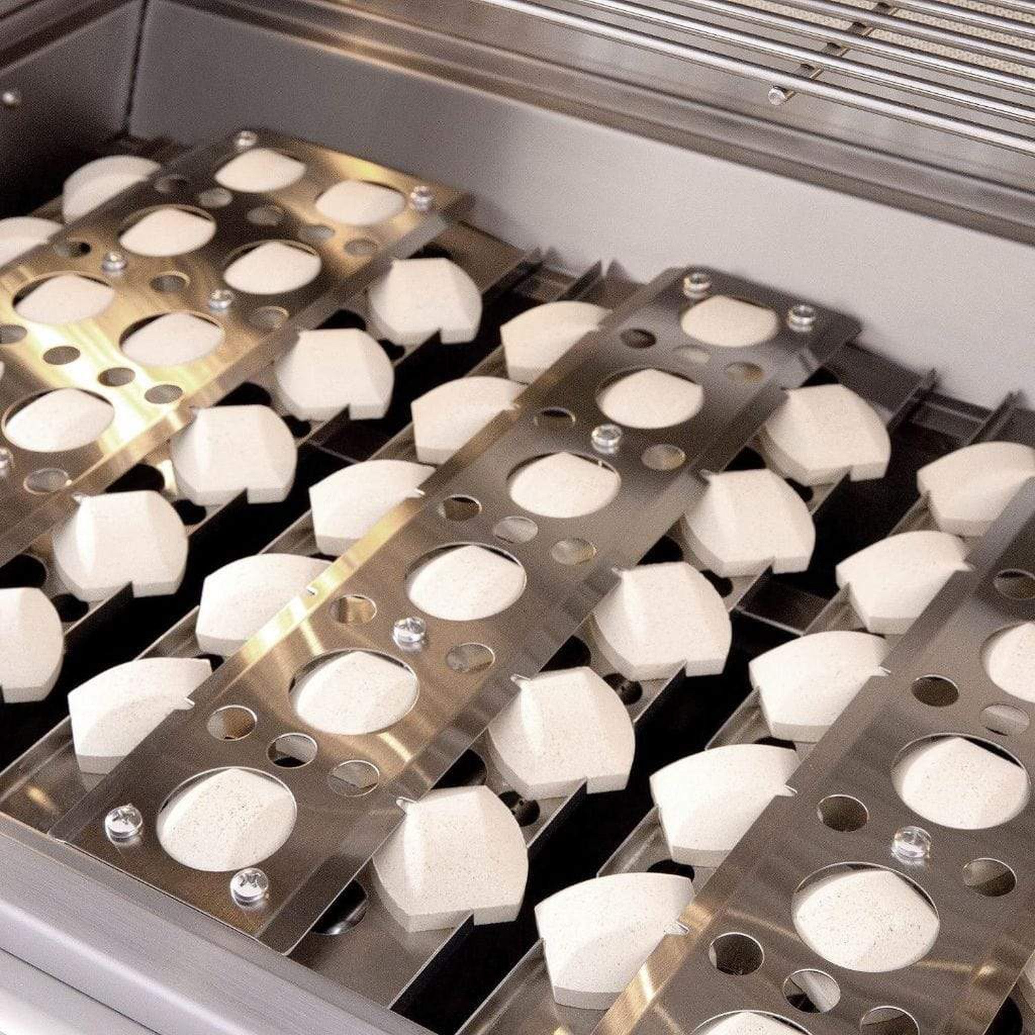 - Captured Briquette Trays: Unique ceramic briquettes sit above the burner to provide radiant heat and eliminate hot/cold zones across the 1,200in² cooking surface