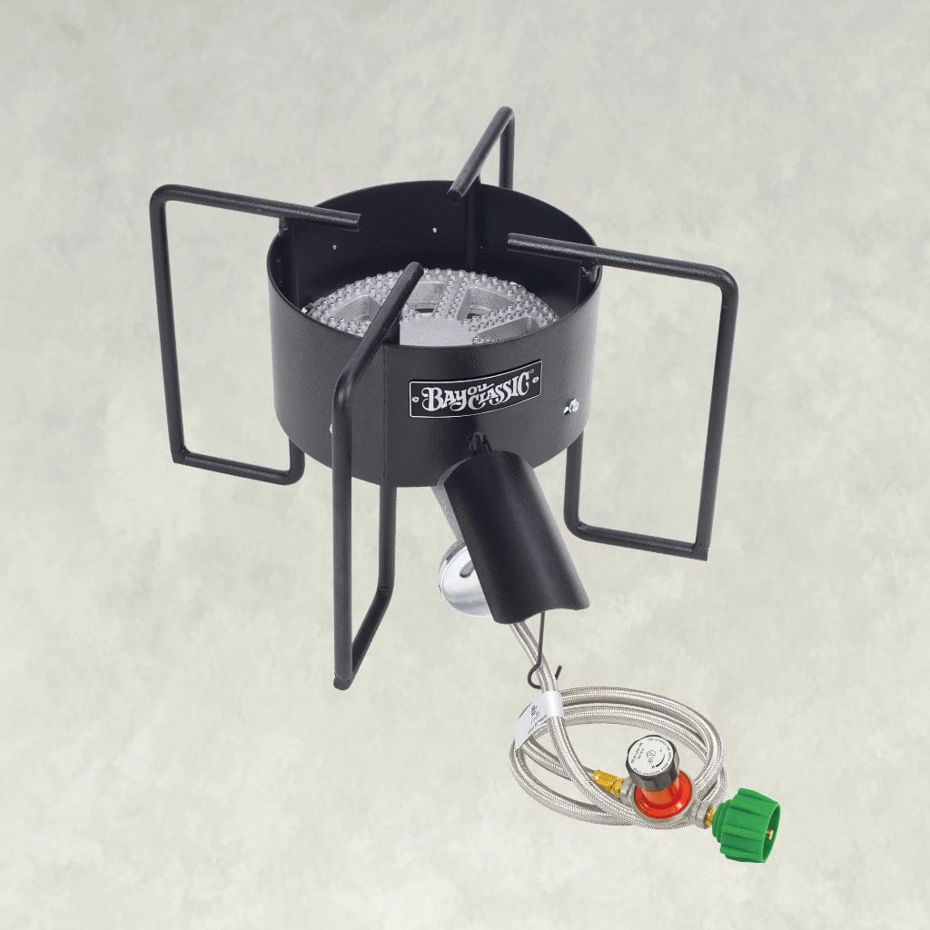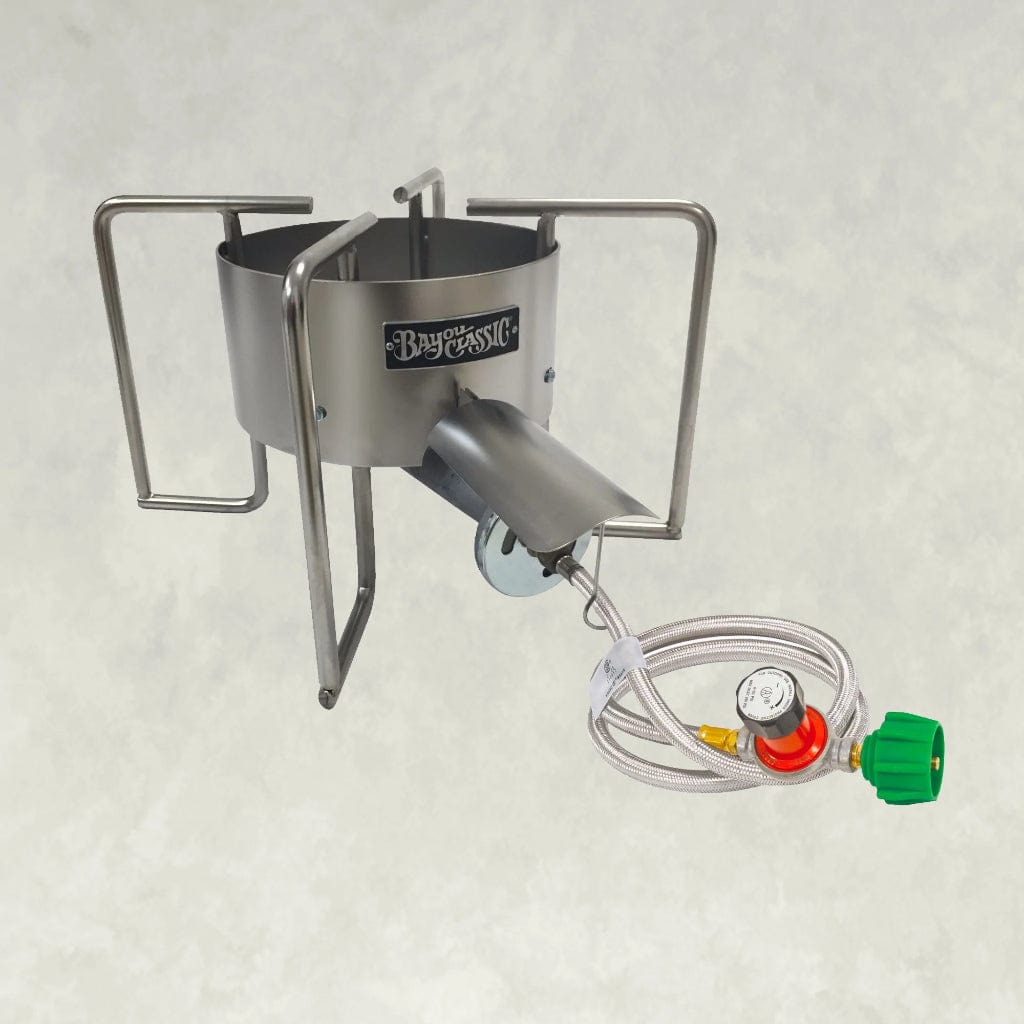 Intended for large batch cooking with a broad flame and wide range of flame control. Burner provides infrared cooking on low settings, and inferno flames when turned up high.