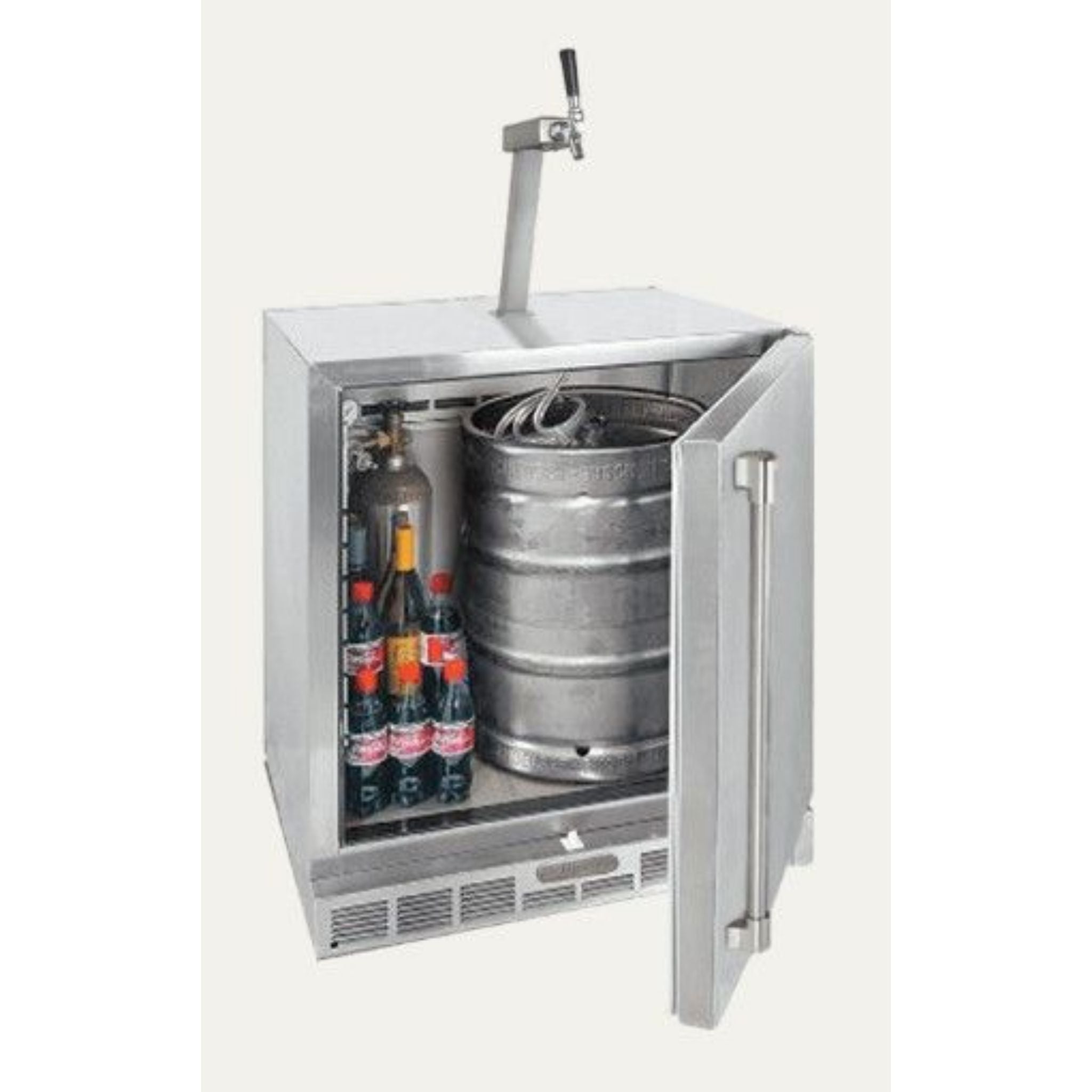 The Alfresco Kegerator Conversion kit includes an Alfresco-built stainless steel tower with faucet, CO2 tank, beer lines with quick disconnect, pressure gauges, and a drip tray with an anti-splash stainless steel grate.