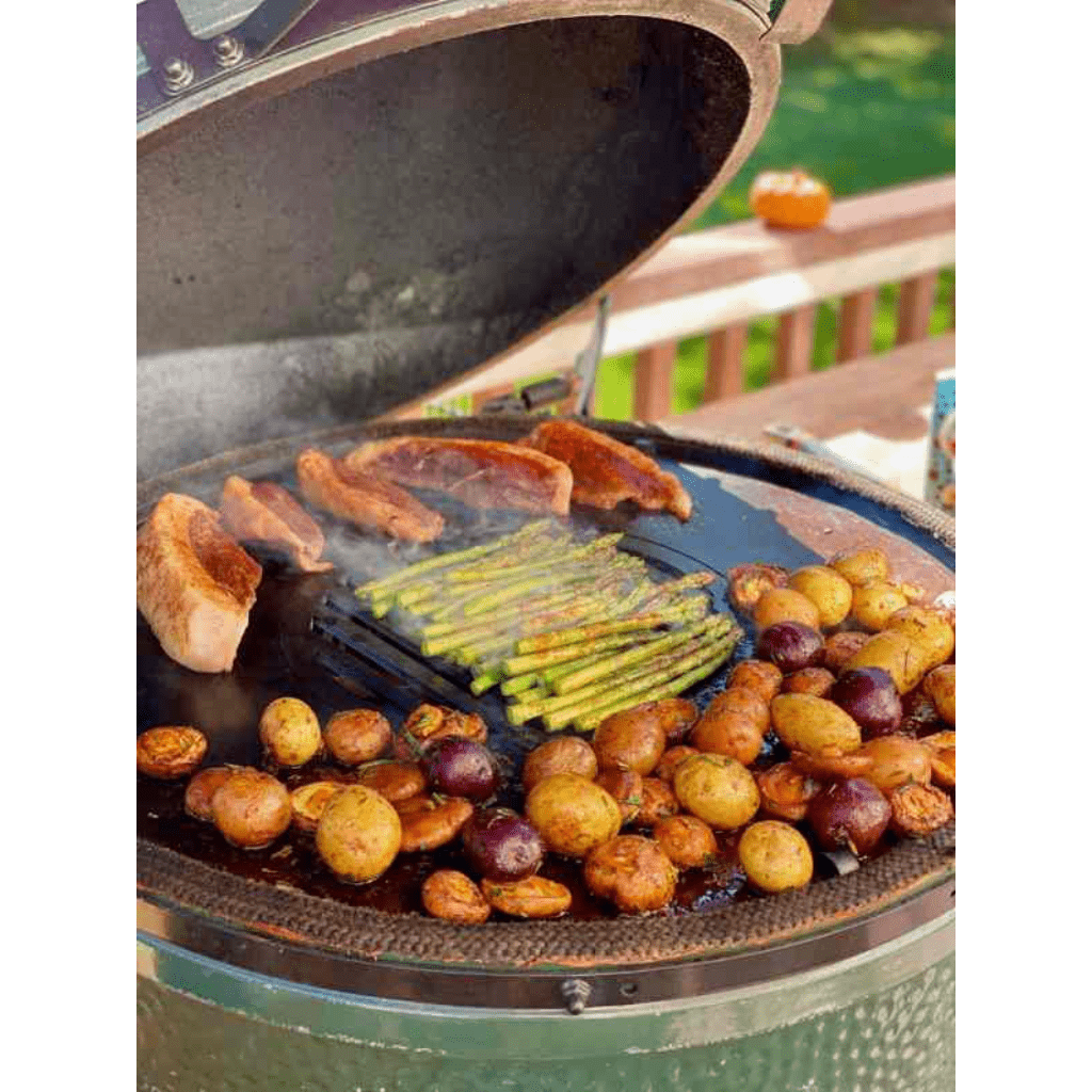 Green Egg Style or Kamado Style Grill Grate Replacement Inserts by Arteflame combine grill and griddle into one insert. MADE in the USA, Arteflame inserts are perfect for grilling seafood, steaks, burgers, veggies and more. The griddle eliminates the slots through which the falls and loses all its juiciness. Perfect for getting that delicious smokey flavor without the burn.