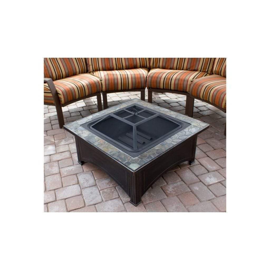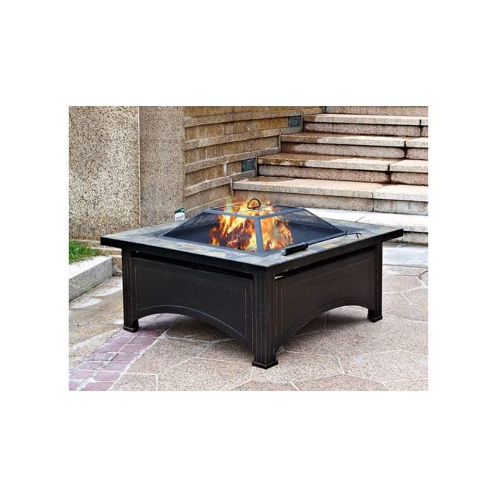 Add warmth & ambiance to your patio, deck, or backyard with this round wood-burning fire pit. This fire pit is made of sturdy steel with an Antique Black finish. It features a square shape & slate fire table to complement any style & is easily portable. Its deep bowl makes this fire pit ideal for burning larger fires & even roasting marshmallows! It comes complete with an easy-to-lift mesh spark guard & wood grate.