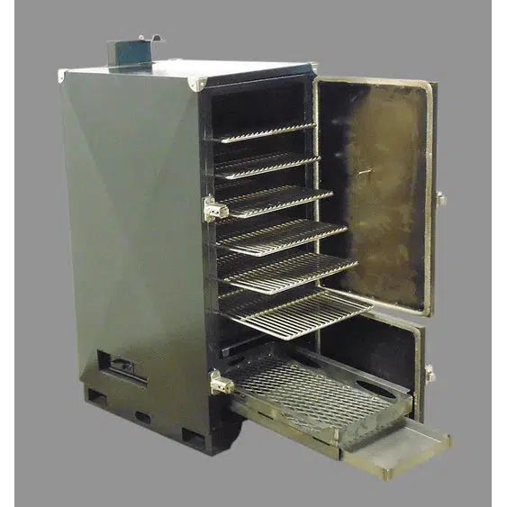 This smoker has 6 heavy duty racks that are 23 inches deep, and it can also hold a full size steam table pan. It comes standard with a heat diverter, the fire and ash pan are on rails for easy loading, and the ash pan can slide out with the fire pan for easy cleaning. Thanks to the longer water and fire pans, you are able to get a longer burn time before you have to add water and charcoal to the smoker.