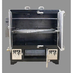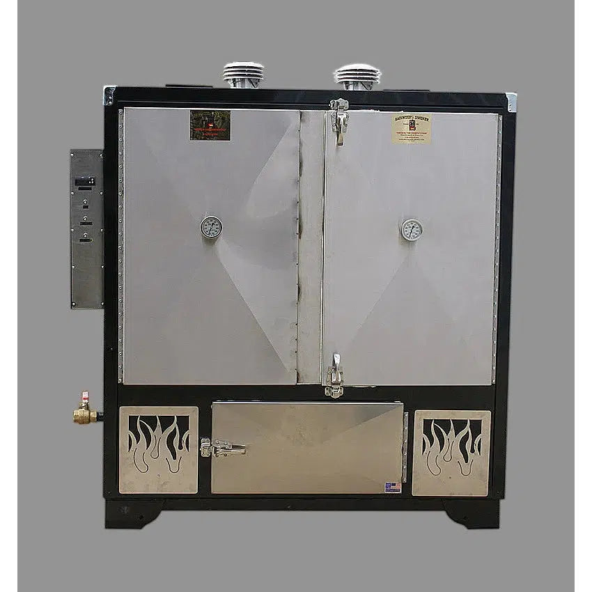 The standard Whole Hog comes with stainless doors and latches, as well as the new low profile smoke stacks. A butterfly valve with special open/close mechanism is standard on this Backwoods model.