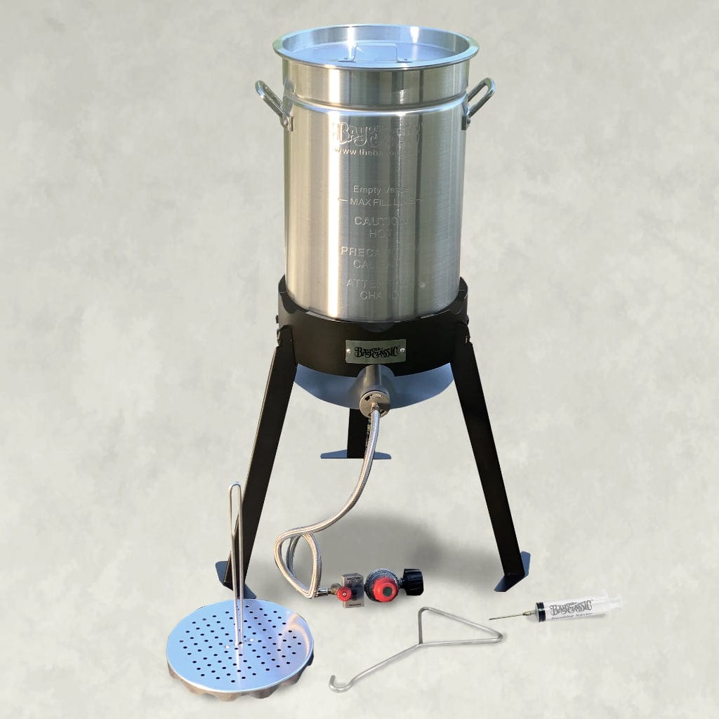 Bayou Classic® 30-qt Aluminum Turkey Fryer is specifically designed to fry up to an 18-lb whole turkey in as little as 45 minutes. This versatile stockpot can also be used for large-scale entertaining and family meals; whether boiling a seafood feast, simmering chili and soups, or frying a turkey. Heavy riveted handles allow for easy transfer. Dining indoors or eating alfresco, Bayou Classic understands the importance of presentation and is the preferred choice of adventurous backyard chefs everywhere.