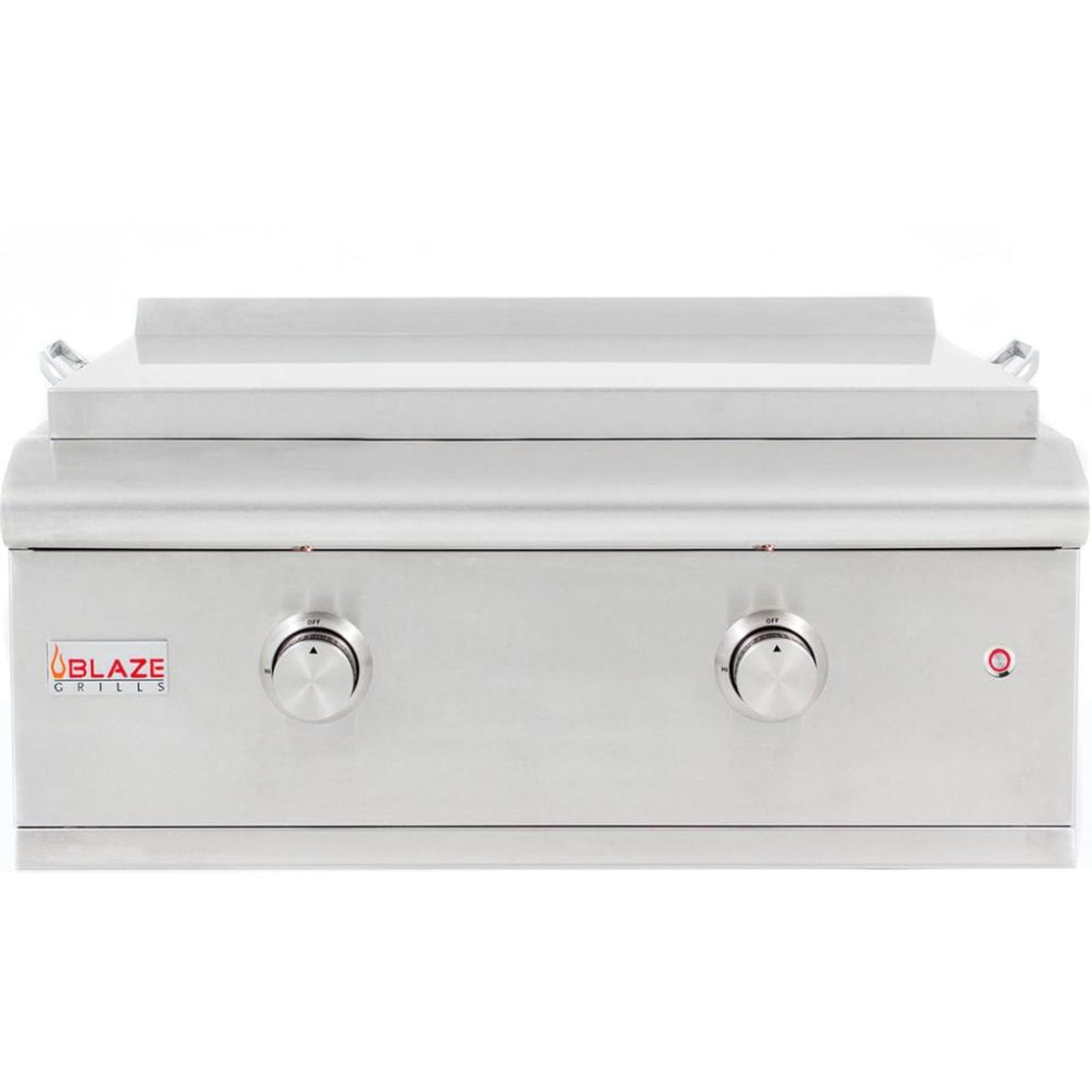 Expand your outdoor cooking into new realms with the Blaze built-in gas griddle. This Blaze built-in gas griddle is equipped with two commercial quality, 304 stainless steel U-shaped burners that each deliver 18,000 BTUs of cooking power for a total of 36,000 BTUs across the 495 square inch cooking surface. Push and turn flame-thrower primary ignition, backup flash tube secondary ignition and cross tubes ensure a steady, reliable flame with every start. A full-width grease trough with a hole in the center directs grease down to the drip tray below for easy cleaning. This ETL certified gas griddle is constructed entirely with heavy-duty, 304 grade stainless steel and includes a stainless steel lid to cover the griddle plate when not in use.