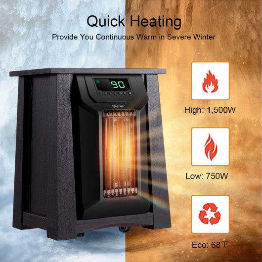 This is the digital quartz infrared heater which can take the chill out of the air in your home. This heater features 8 of our metal wrapped quartz infrared elements oscillation function. And it has a washable air filter and uses up to 1500-watts. There are 3 heating settings including an ECO setting that will heat smaller areas to 68°f. The heater designs with 4 caster wheels makes it easy to carry from room to room to enjoy the benefits of zone heating. This compact heater also includes a remote control providing more portability. Timer settings can be used to turn on or off the heater up to 12 hours ahead. If you consider buying a heater you'll be definitely satisfied with it.