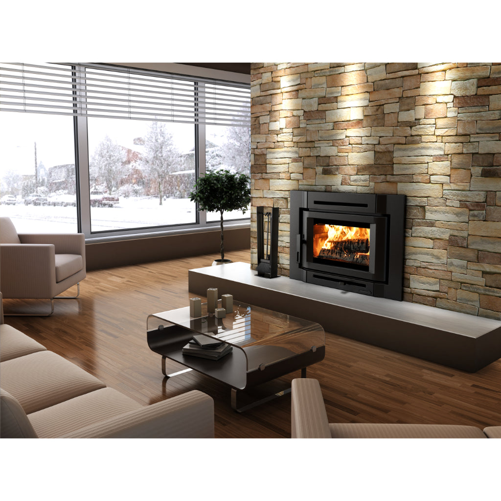 The Destination 2.3-I is really a blend of technological improvement and design advancement. Cast iron was the material of choice for the smooth contemporary surround and designed for a flush finish designed to be installed in a masonry fireplace. An optional backing plate is available for larger masonry openings. Maintenance of electrical components was made easy with the conception of a slick, drawer-like system to which the blower assembly attaches. The heat activated blower assembly (90 CFM) can be operated in automatic, manual or OFF mode.