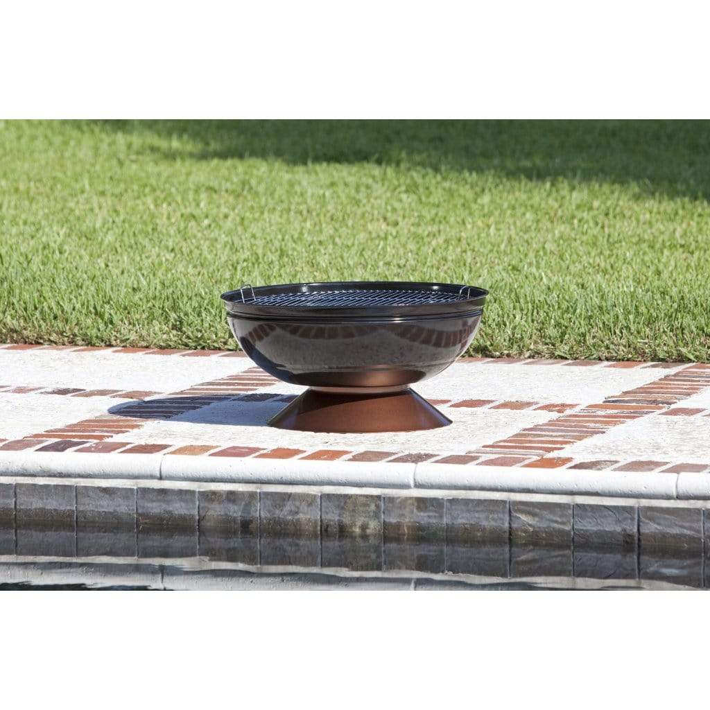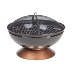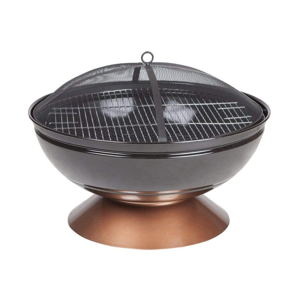 This unique 26" fire pit features an attractive enamel-painted fire bowl and base with a beautiful copper and black gradual finish. This fire pit comes complete with a dome mesh spark screen with high heat paint and a screen lift tool. Also included is a wood grate and a cooking grate.