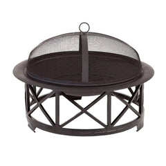This unique fire pit features a 30" black steel fire bowl which sits atop a decorative powder coated steel base. This fire pit comes complete with a one piece dome spark screen with high heat paint and a wood grate. Also included is a screen lift tool.
