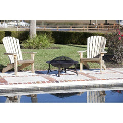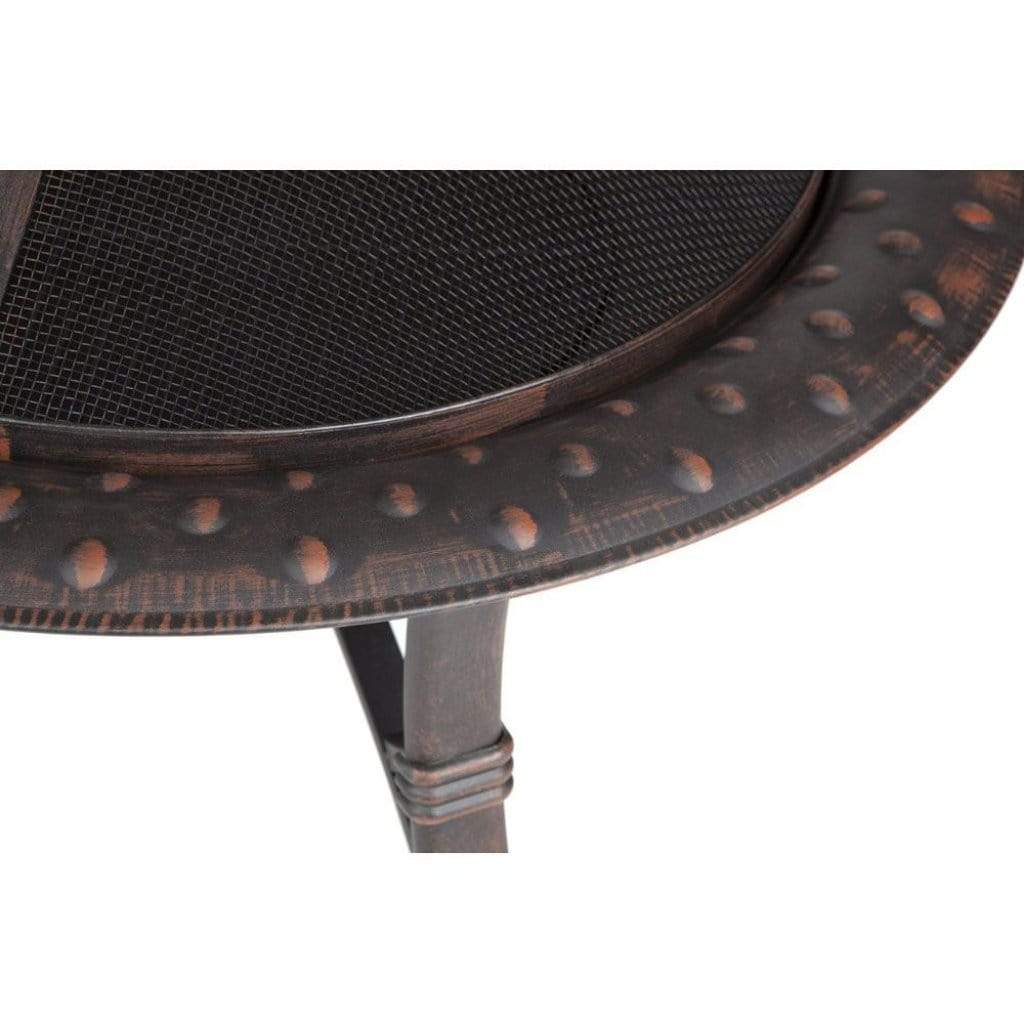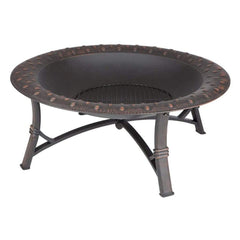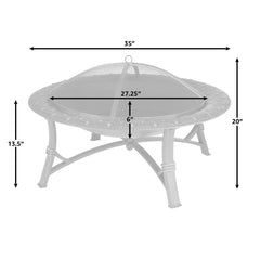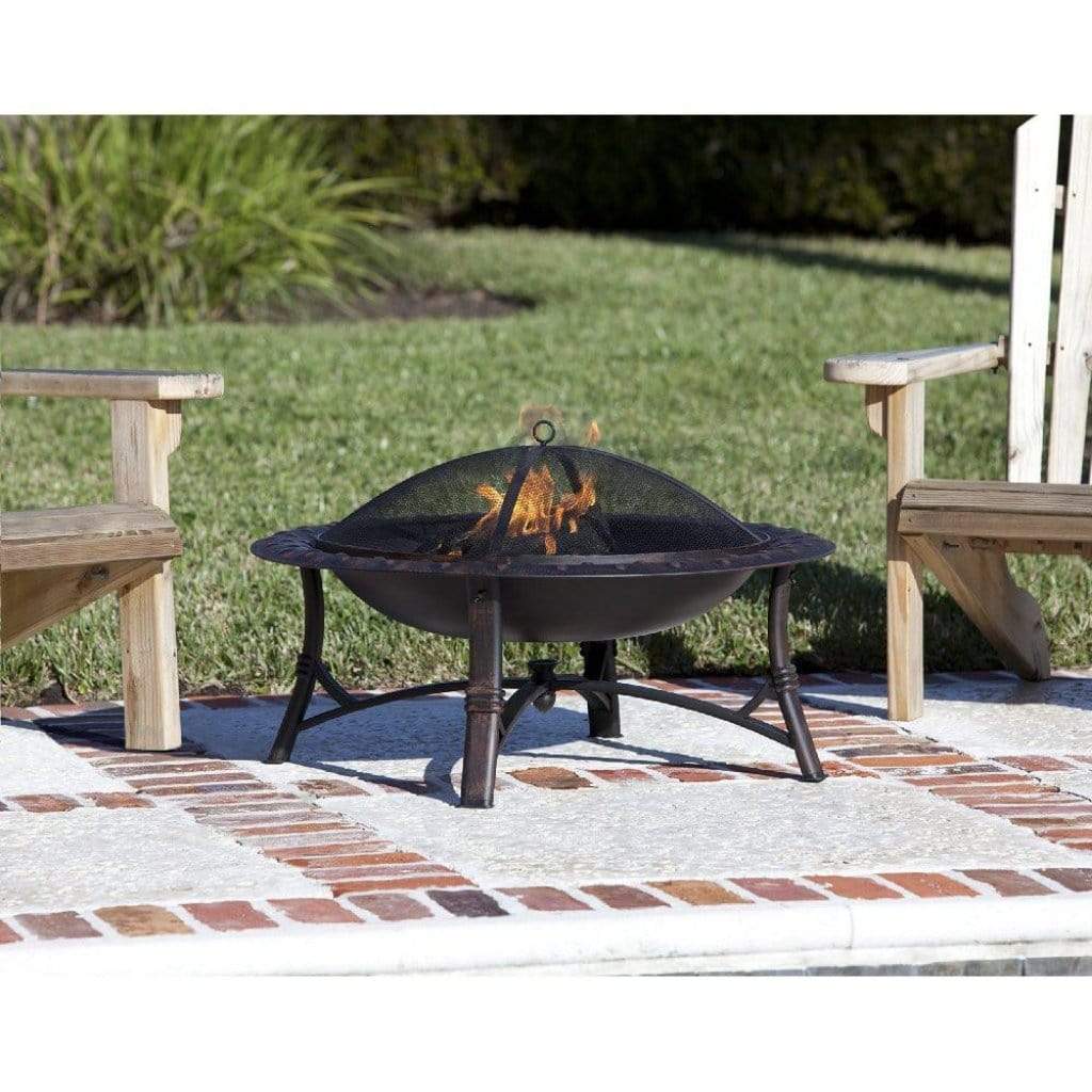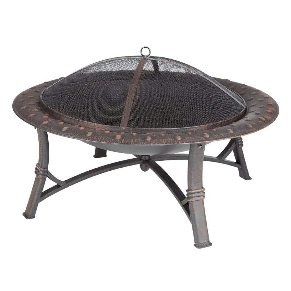 This unique fire pit features a 35" high temp antique bronze painted steel fire bowl with hammered lip, and brushed painted steel legs. This fire pit comes complete with mesh fire screen with high heat paint and a wood grate. Also included is a screen lift tool.