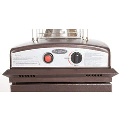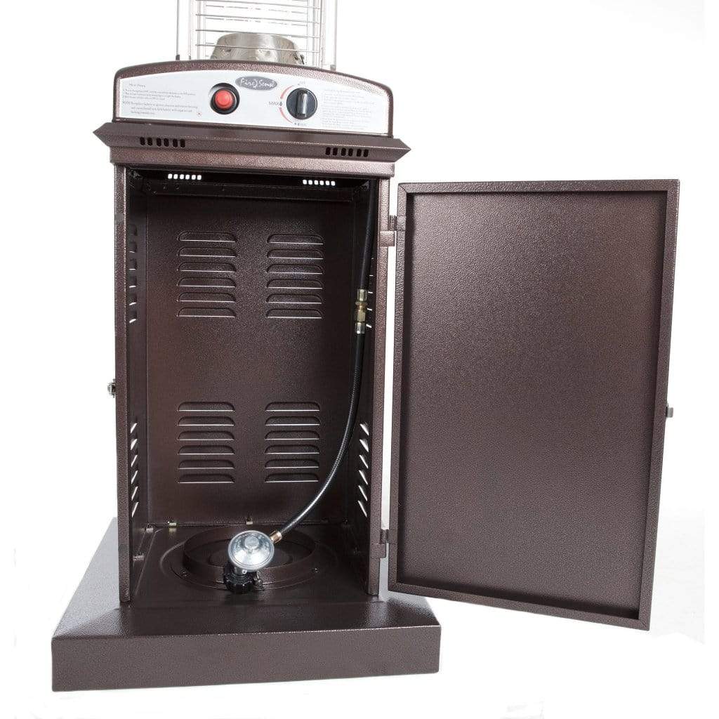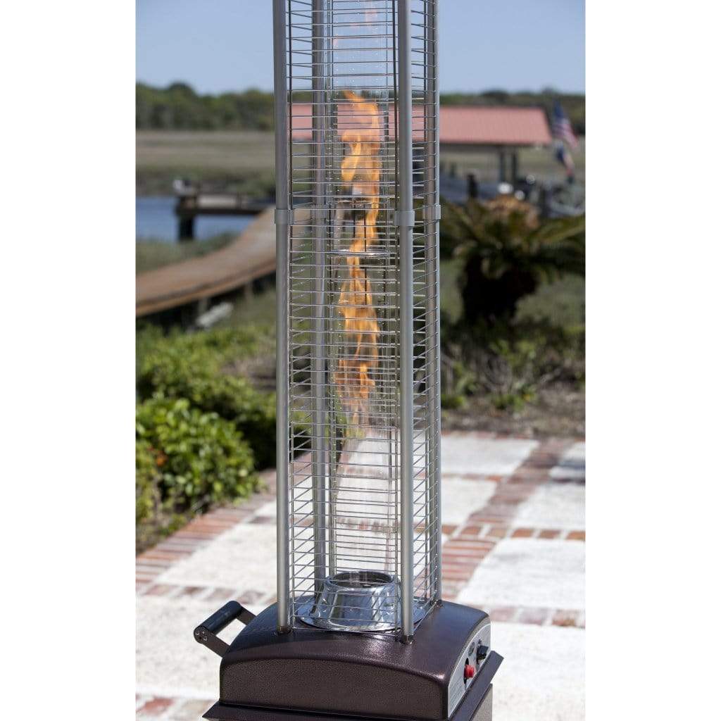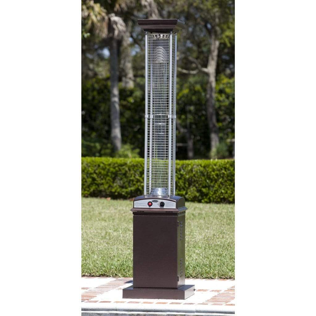 The new patented Hammered Bronze Finish Square Flame Patio Heater brings a new dimension to outdoor heating. The stylish unit provides a uniquely visual flame while providing heat in every direction. This superior burner technology and built in emitter enables this unit to produce more heat than any other flame heater on the market. This attractive piece of functional art will be the focal point of any outdoor setting. This high quality flame heater features a tip over protection system for your safety. Attached wheels provide easy mobility.