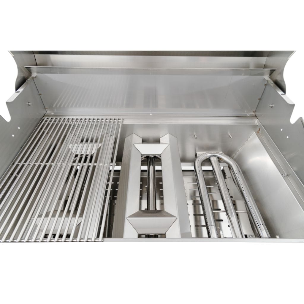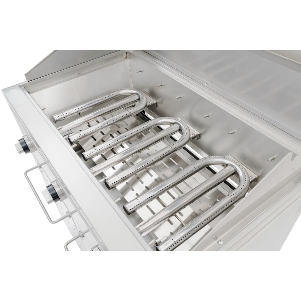 Powerful Engine Our dual U-shaped burner system delivers balanced heat beneath the heavy-duty 8mm solid stainless steel grates preventing “hot spots”. The F27S is powered by two 20,000 BTU/hr. burners for a total output of 40,000 BTU/hr. As shown in the adjacent photo, our triple U- shaped burners look and act like a 4 burner grill. This gives the balance and uniform heat you are looking for in a premium gas grill. Our 304SS burners and their 304SS diffusers come with a five-year warranty. As with all of our grills it heats up to 500F in just 5 minutes and maintains temperatures from 250F-650F.