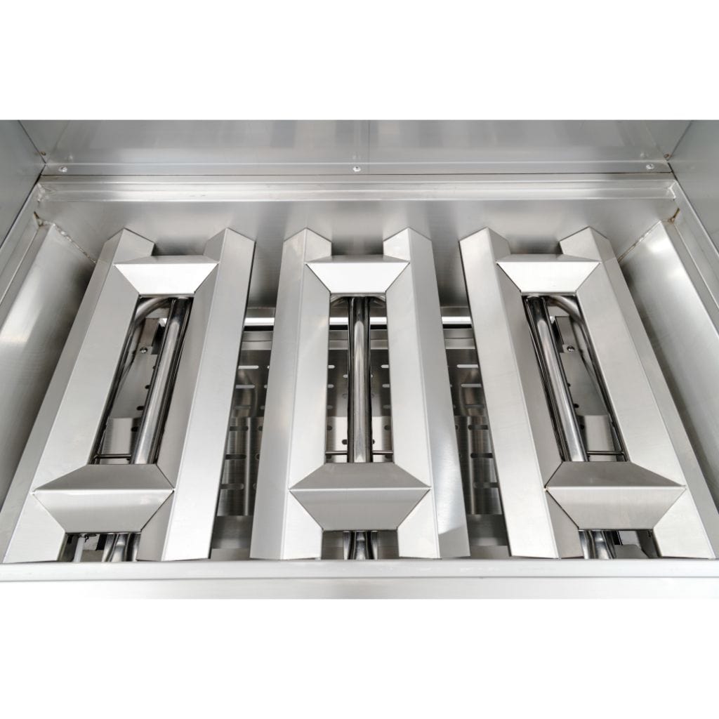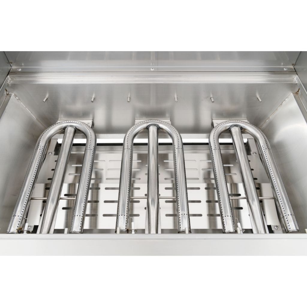 Massive Grilling Surface Our dual U-shaped burner system delivers balanced heat beneath the heavy-duty 8mm solid stainless steel grates preventing “hot spots”. The F36S is powered by three 20,000 BTU/hr. burners for a total output of 40,000 BTU/hr. As shown in the adjacent photo, our triple U- shaped burners look and act like a 6 burner grill. This gives the balance and uniform heat you are looking for in a premium gas grill. Our 304SS burners and their 304SS diffusers come with a five-year warranty. As with all of our grills it heats up to 500F in just 5 minutes and maintains temperatures from 250F-650F.