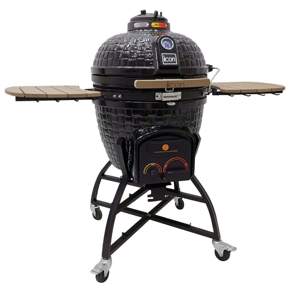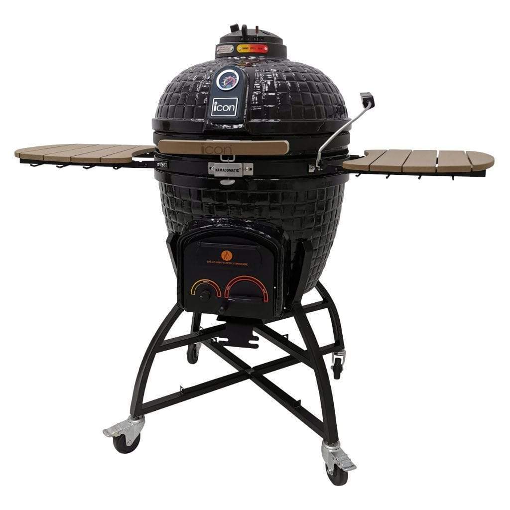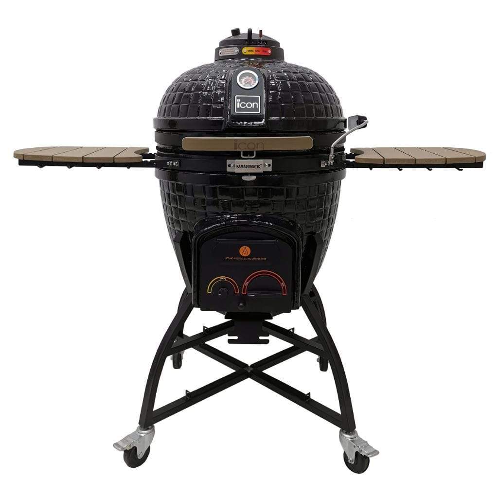 Icon XR402 Deluxe Kamado grill, Black. 604 sq. in. cooking surface. Features: Color Coded Cast Iron Vent top Vent with smoker knob, cast iron, and stainless steel cooking Grids, Easy lift Kamadomatic hinge, upgraded felt & Locking latch for a superior seal, Wood sculpted thermoplastic side shelves with accessory hooks, electric starter port for easy start-up (electric starter included), removable ashtray for easy cleanout, extra-wide storage cart with 3" caster wheels. The grill comes with an electric starter, a flexible grill light, and a cover. Add grilling versatility with the Quickchange Gas Insert available for Natural Gas and Propane, Sold Separately.