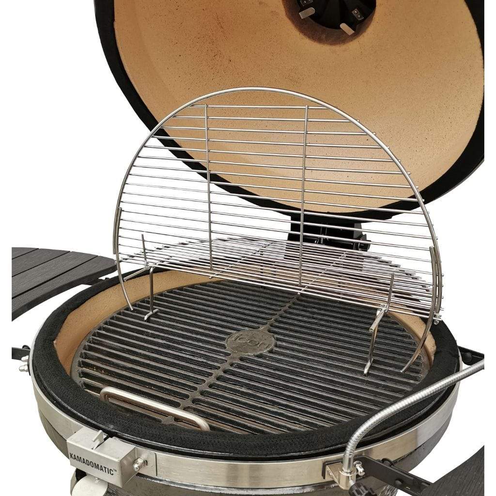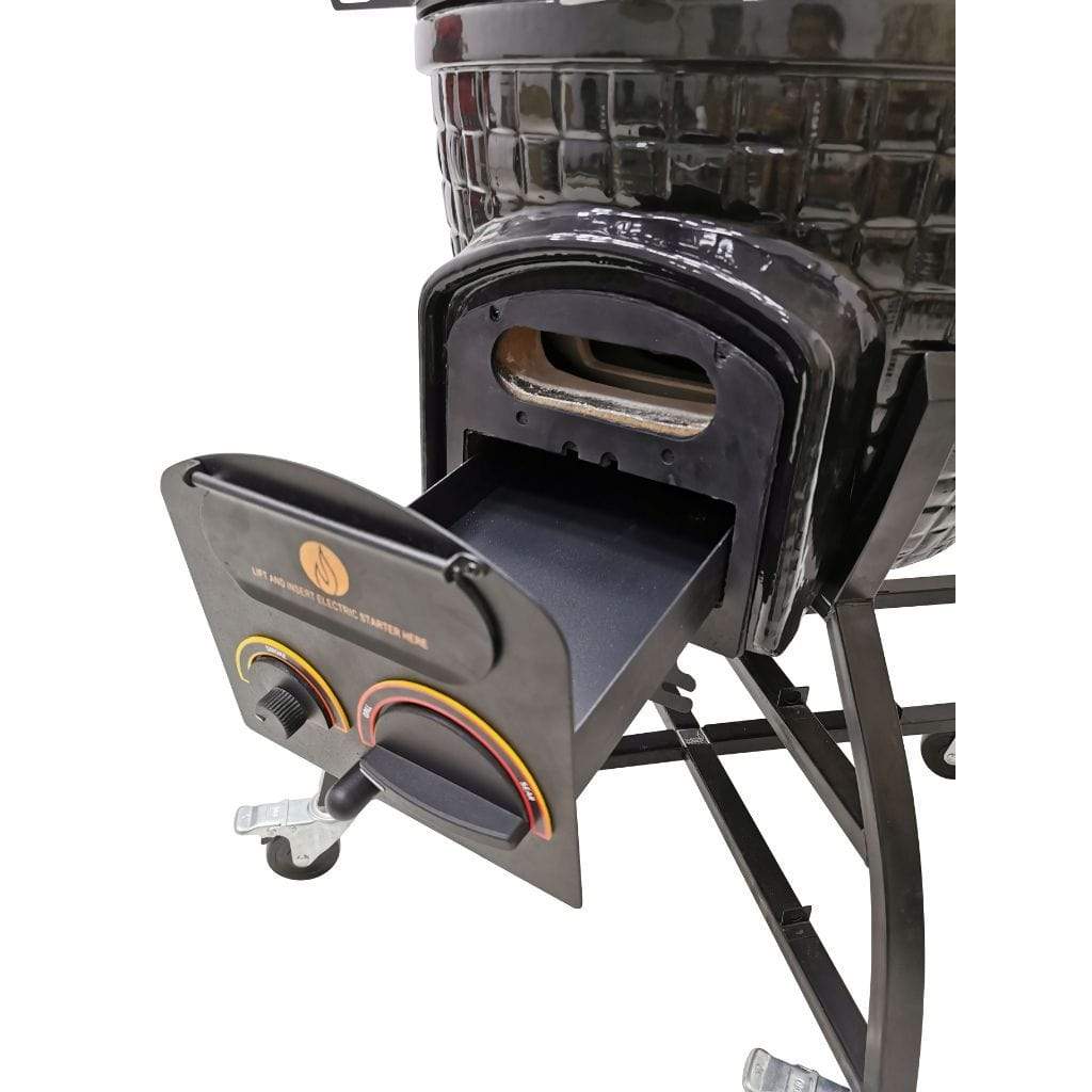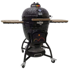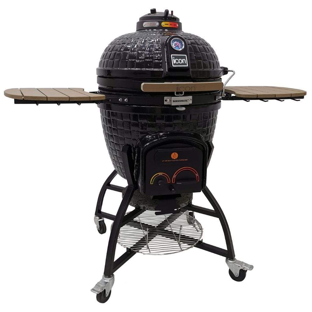 Icon XR402 Deluxe Kamado grill, Black. 604 sq. in. cooking surface. Features: Color Coded Cast Iron Vent top Vent with smoker knob, cast iron, and stainless steel cooking Grids, Easy lift Kamadomatic hinge, upgraded felt & Locking latch for a superior seal, Wood sculpted thermoplastic side shelves with accessory hooks, electric starter port for easy start-up (electric starter included), removable ashtray for easy cleanout, extra-wide storage cart with 3" caster wheels. The grill comes with an electric starter, a flexible grill light, and a cover. Add grilling versatility with the Quickchange Gas Insert available for Natural Gas and Propane, Sold Separately.