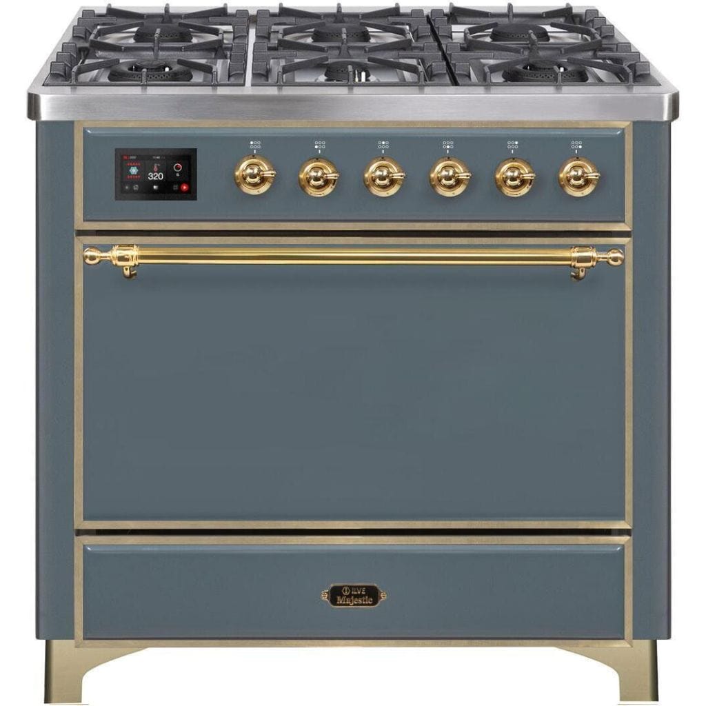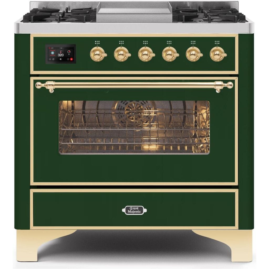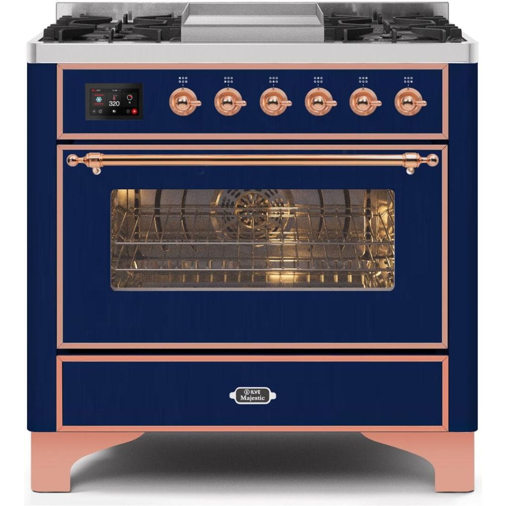 Majestic II Series 36 Inch Freestanding Dual Fuel Range with Liquid Propane, 6 Sealed Burners, 3.5 cu. ft. Total Oven Capacity, Griddle, Convection Oven, Self-Clean Oven, Continuous Grates, Viewing Window, Warming Drawer, Oven: Defrost Function, Gas Conversion Kit Included, Handcrafted from Italy, High-End Workmanship, TFT Oven Control Display, Nano-Tech Non-Stick Coated Burners, Rotisserie, Interchangeable Griddle with Burner Grate.
