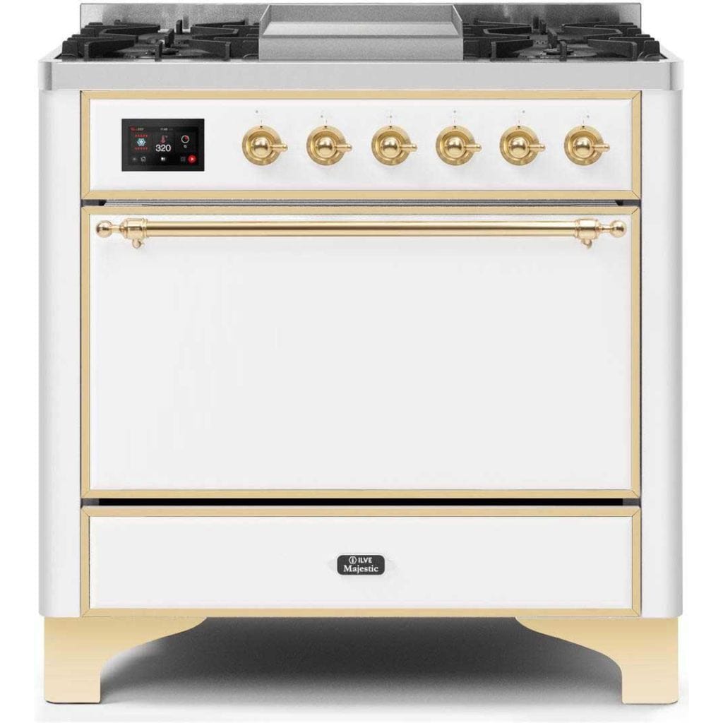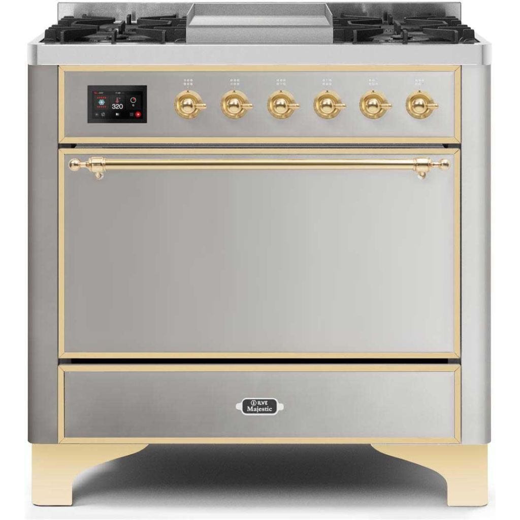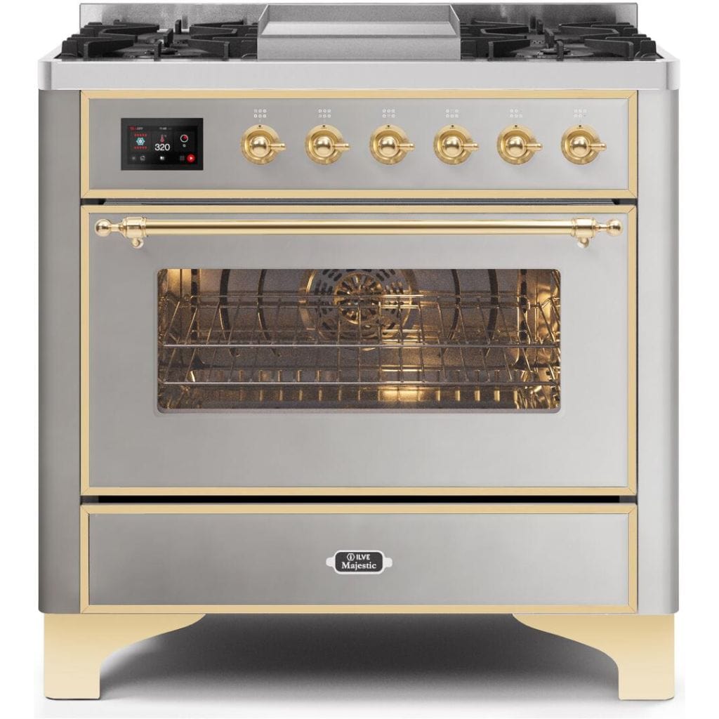 Majestic II Series 36 Inch Freestanding Dual Fuel Range with Liquid Propane, 6 Sealed Burners, 3.5 cu. ft. Total Oven Capacity, Griddle, Convection Oven, Self-Clean Oven, Continuous Grates, Viewing Window, Warming Drawer, Oven: Defrost Function, Gas Conversion Kit Included, Handcrafted from Italy, High-End Workmanship, TFT Oven Control Display, Nano-Tech Non-Stick Coated Burners, Rotisserie, Interchangeable Griddle with Burner Grate.