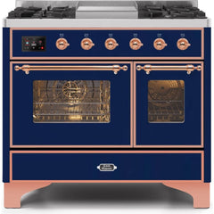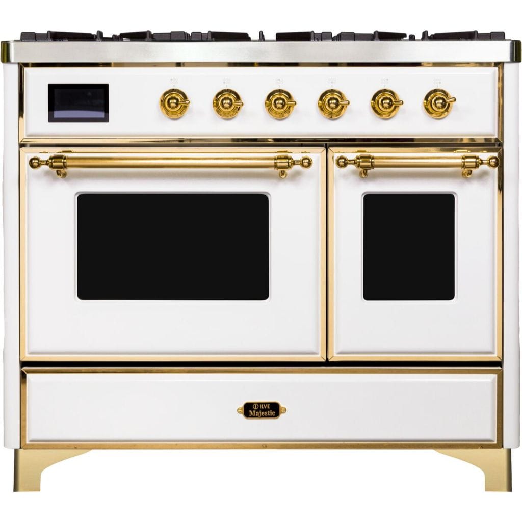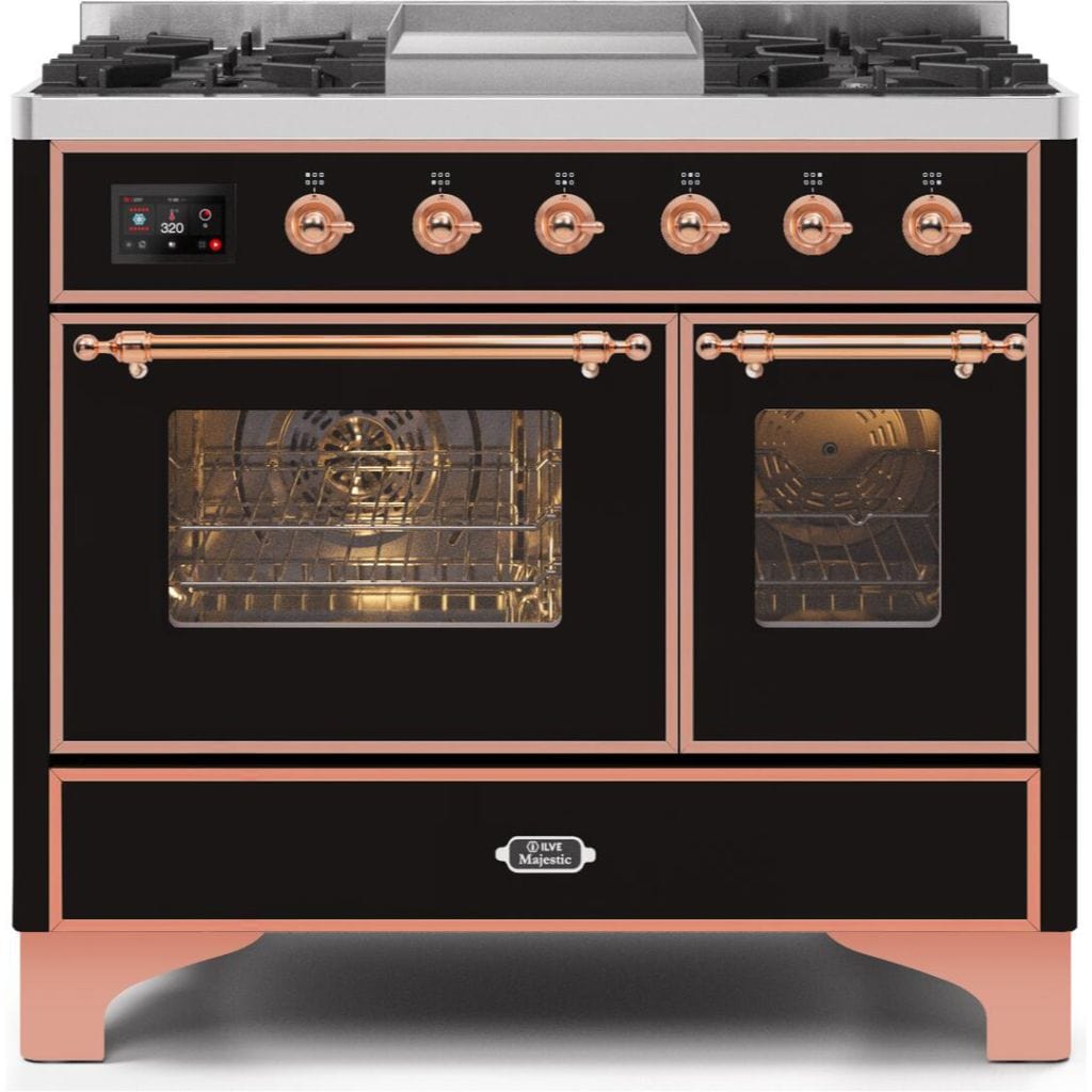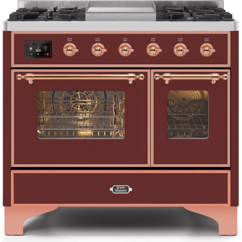 Majestic II Series 40 Inch Freestanding Dual Fuel Range with Liquid Propane, 6 Sealed Burners, Double Ovens, 3.82 cu. ft. Total Oven Capacity, Griddle, Convection Oven, Self-Clean Oven, Continuous Grates, Viewing Window, Warming Drawer, Gas Conversion Kit Included, Handcrafted from Italy, High-End Workmanship, Oven: Defrost Function, TFT Oven Control Display, Nano-Tech Non-Stick Coated Burners, Interchangeable Griddle with Burner Grate with Trim.